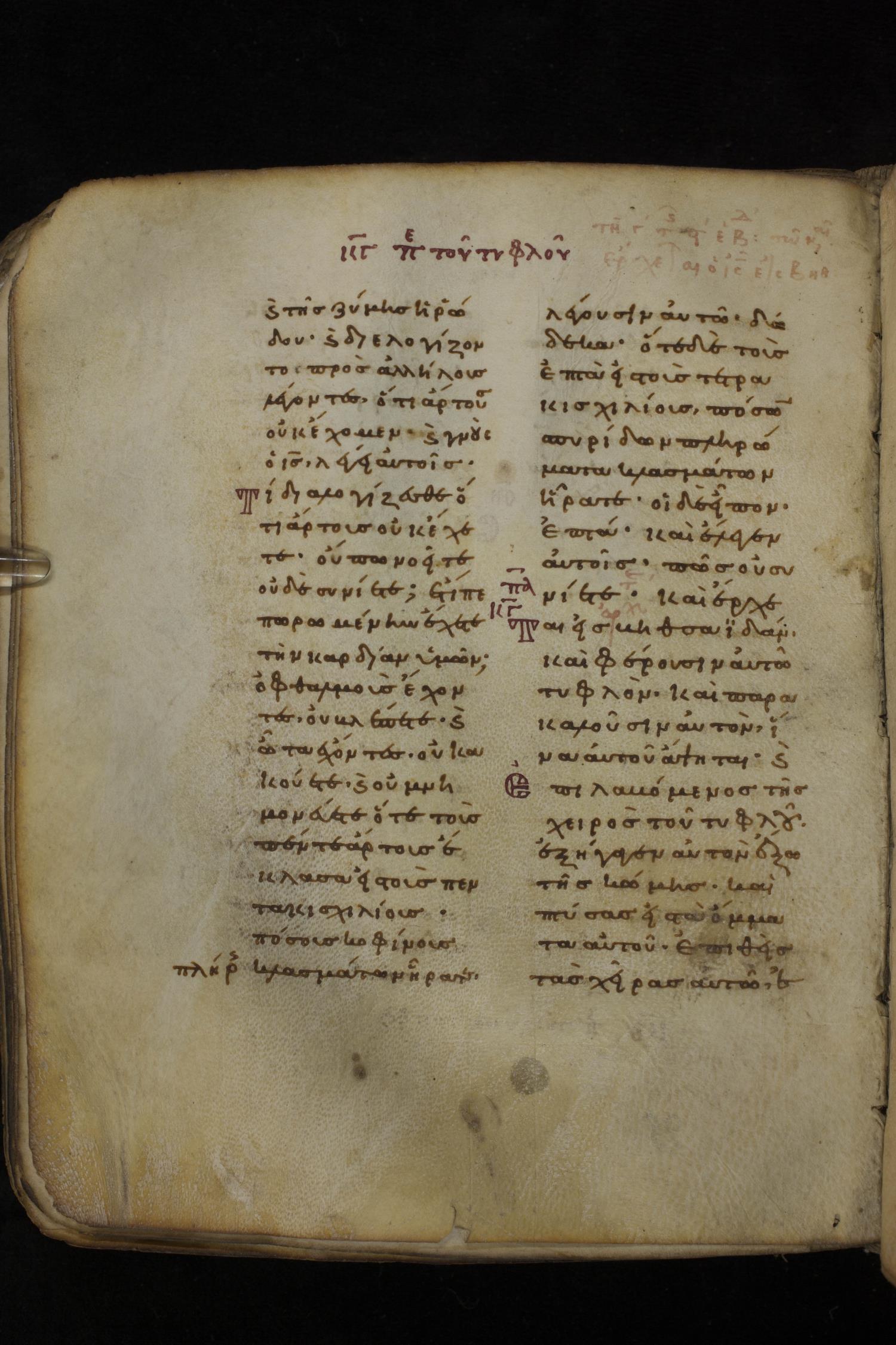 Eleventh century minuscule of the Gospels on parchment; 266 leaves, 2 column, 22 lines per column. Images were taken at the National Library of Greece in Athens.
