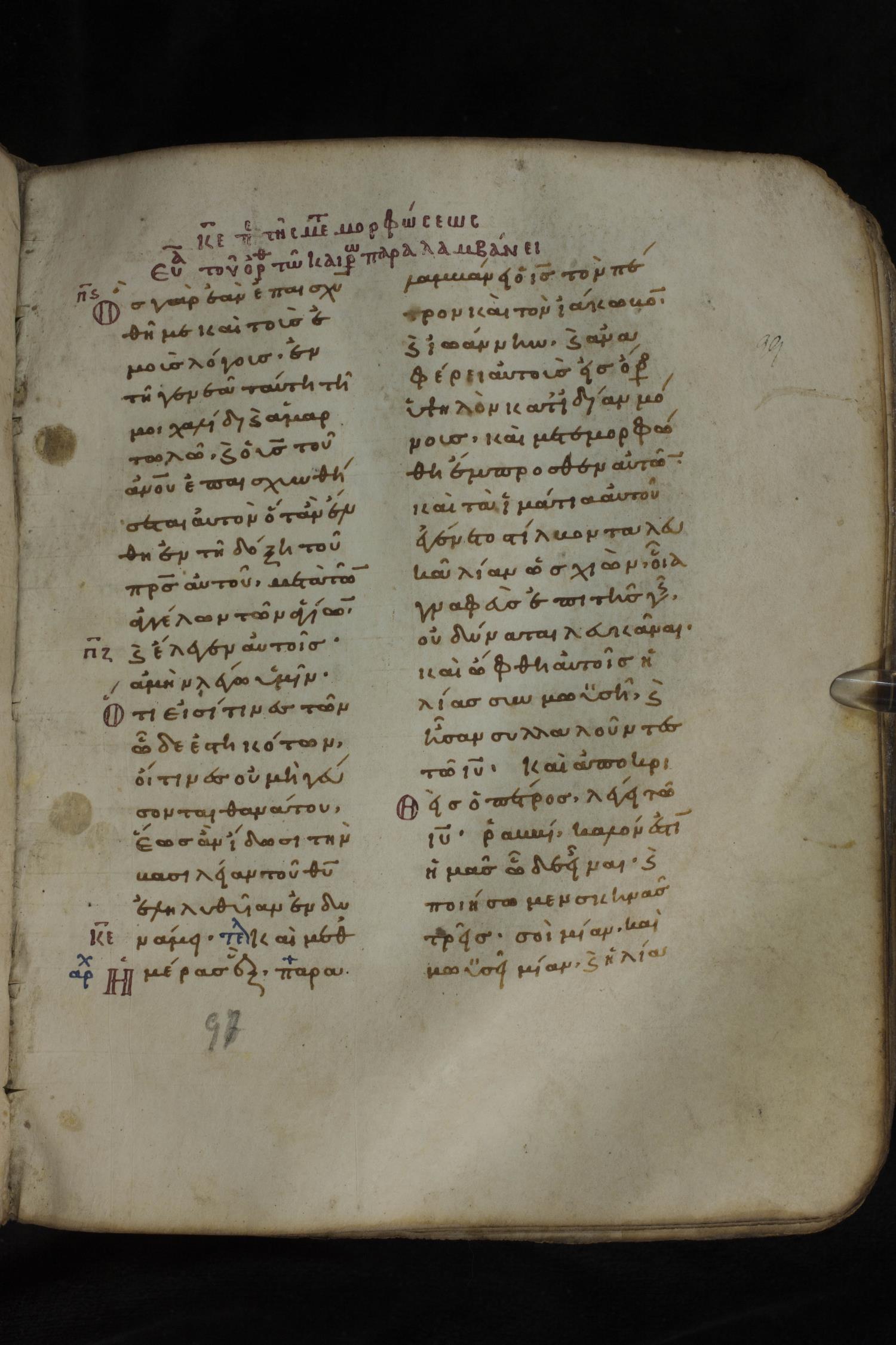 Eleventh century minuscule of the Gospels on parchment; 266 leaves, 2 column, 22 lines per column. Images were taken at the National Library of Greece in Athens.