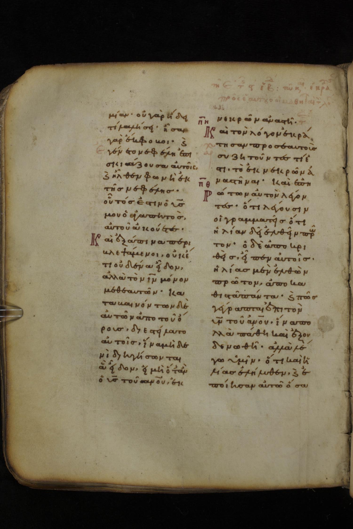 Eleventh century minuscule of the Gospels on parchment; 266 leaves, 2 column, 22 lines per column. Images were taken at the National Library of Greece in Athens.