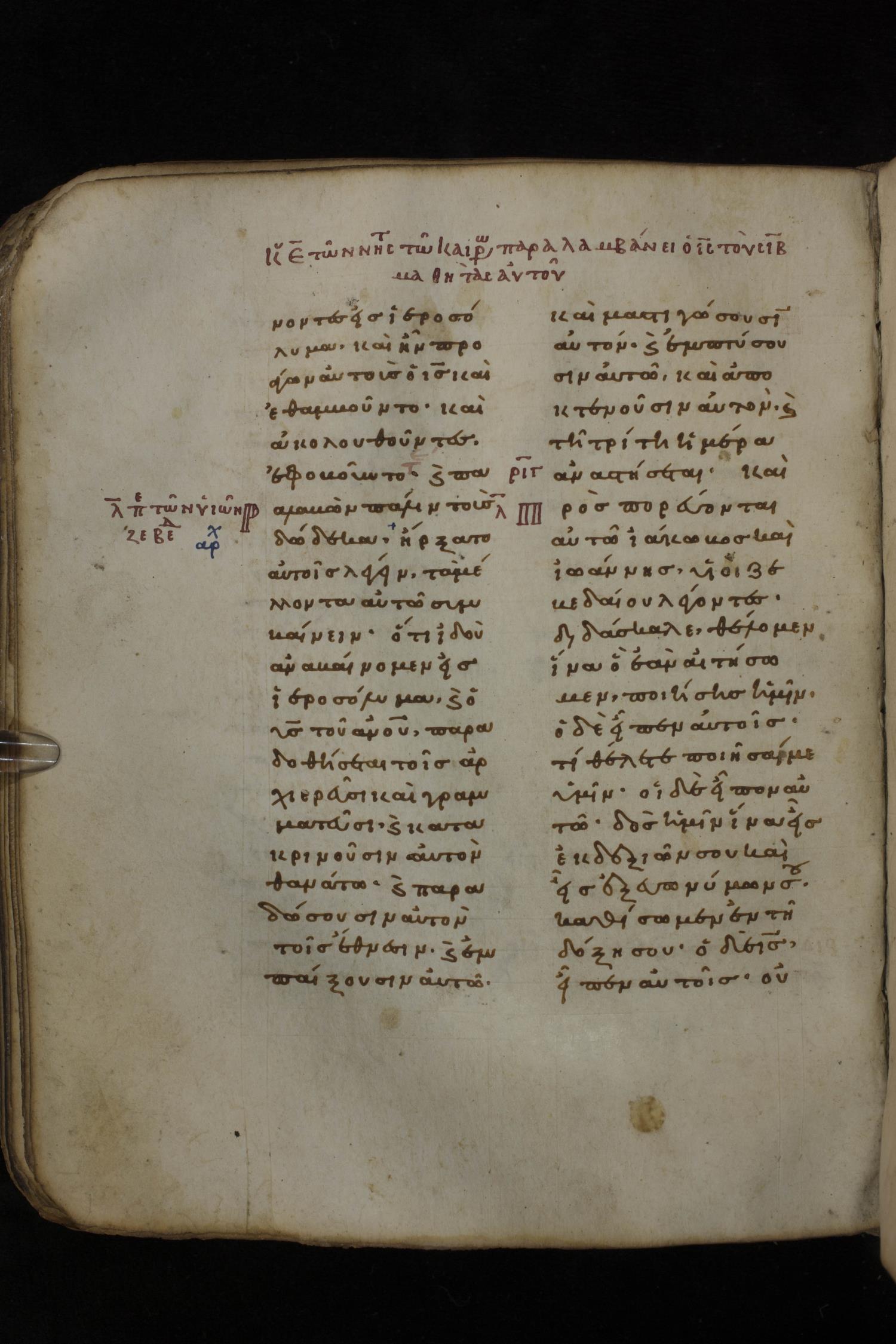 Eleventh century minuscule of the Gospels on parchment; 266 leaves, 2 column, 22 lines per column. Images were taken at the National Library of Greece in Athens.