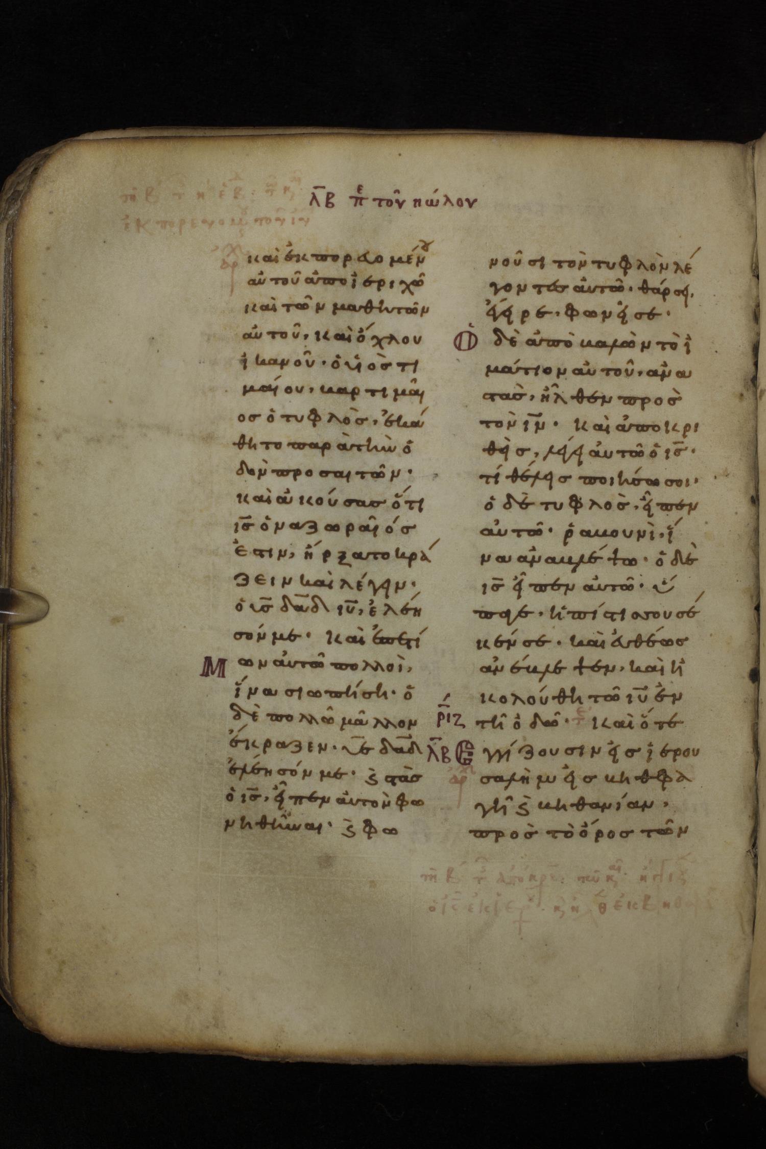 Eleventh century minuscule of the Gospels on parchment; 266 leaves, 2 column, 22 lines per column. Images were taken at the National Library of Greece in Athens.