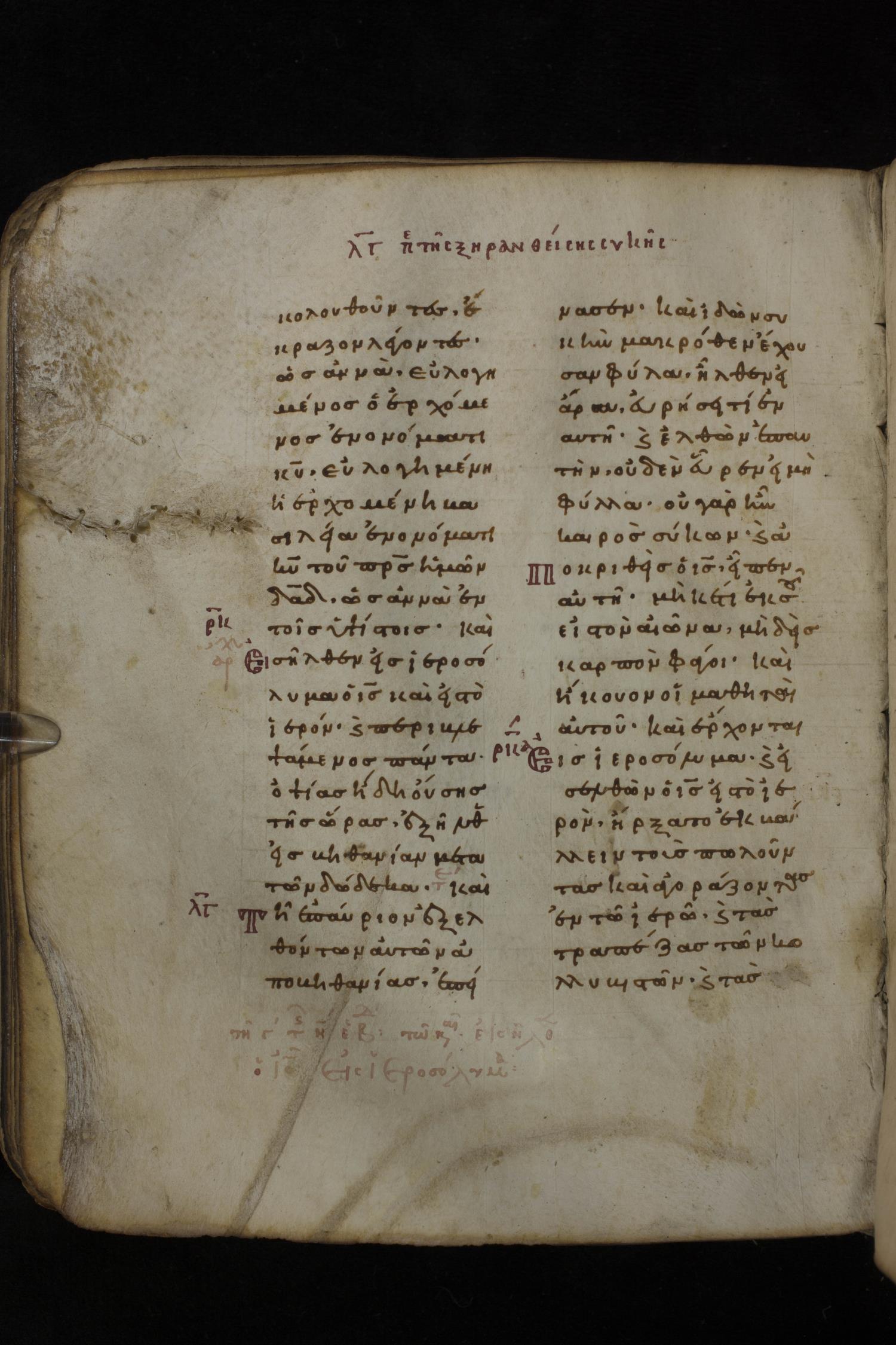 Eleventh century minuscule of the Gospels on parchment; 266 leaves, 2 column, 22 lines per column. Images were taken at the National Library of Greece in Athens.