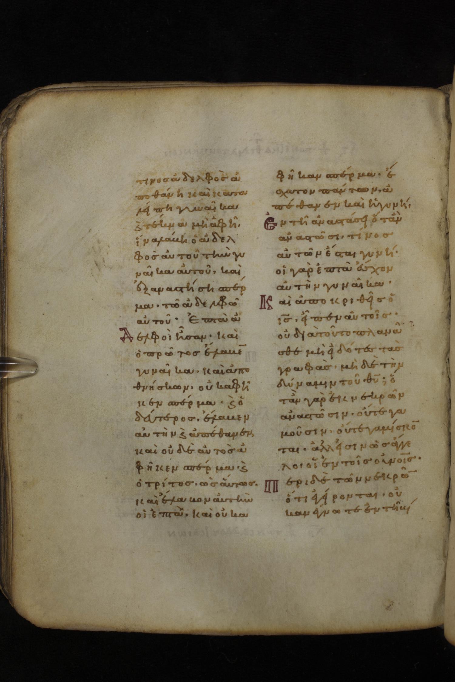 Eleventh century minuscule of the Gospels on parchment; 266 leaves, 2 column, 22 lines per column. Images were taken at the National Library of Greece in Athens.