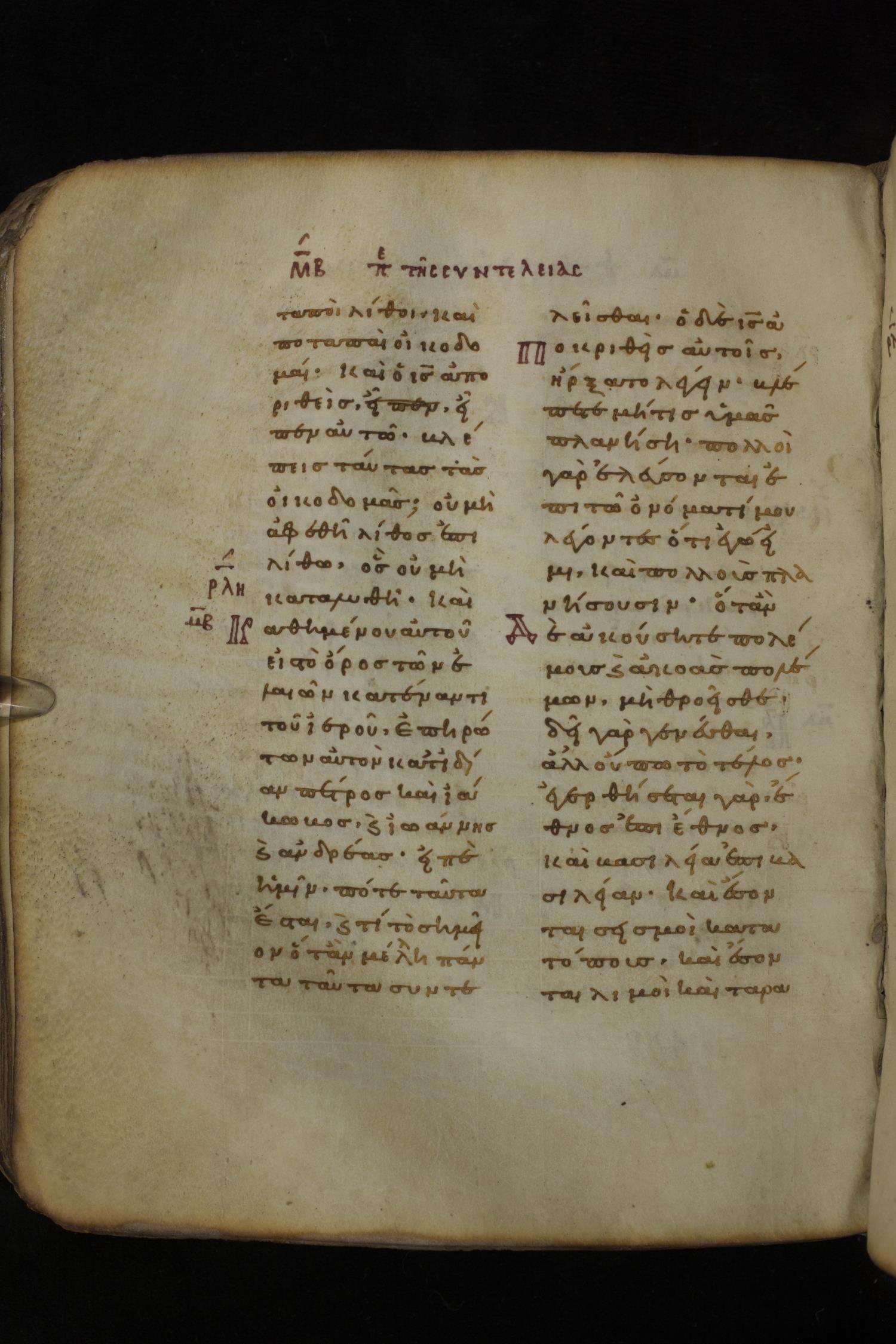 Eleventh century minuscule of the Gospels on parchment; 266 leaves, 2 column, 22 lines per column. Images were taken at the National Library of Greece in Athens.