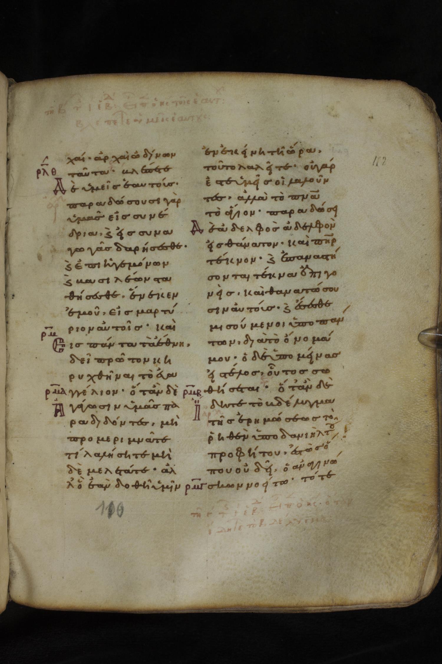 Eleventh century minuscule of the Gospels on parchment; 266 leaves, 2 column, 22 lines per column. Images were taken at the National Library of Greece in Athens.