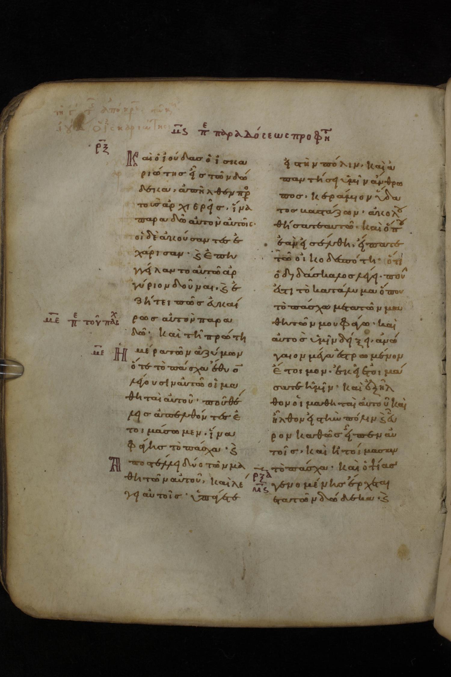Eleventh century minuscule of the Gospels on parchment; 266 leaves, 2 column, 22 lines per column. Images were taken at the National Library of Greece in Athens.