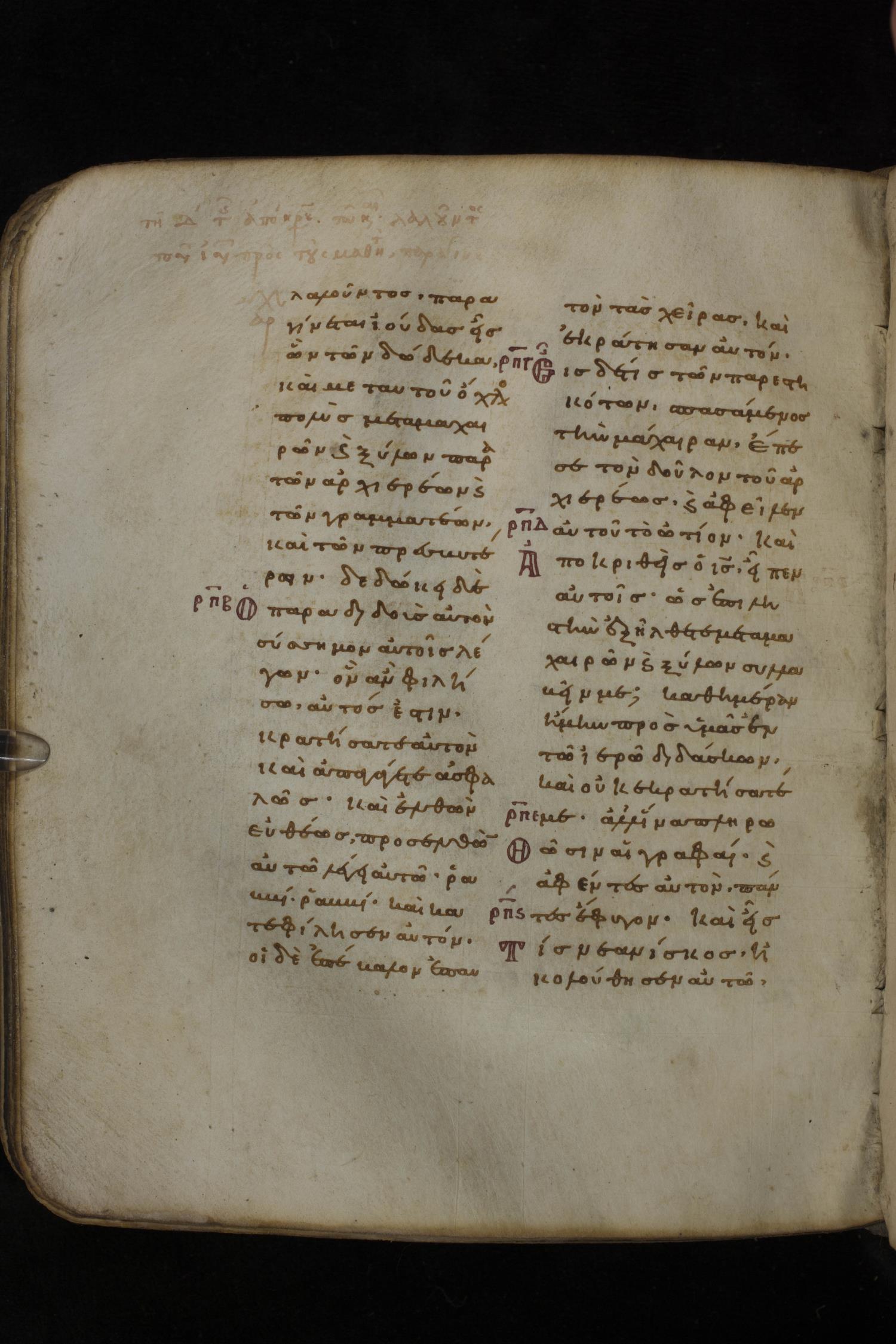 Eleventh century minuscule of the Gospels on parchment; 266 leaves, 2 column, 22 lines per column. Images were taken at the National Library of Greece in Athens.