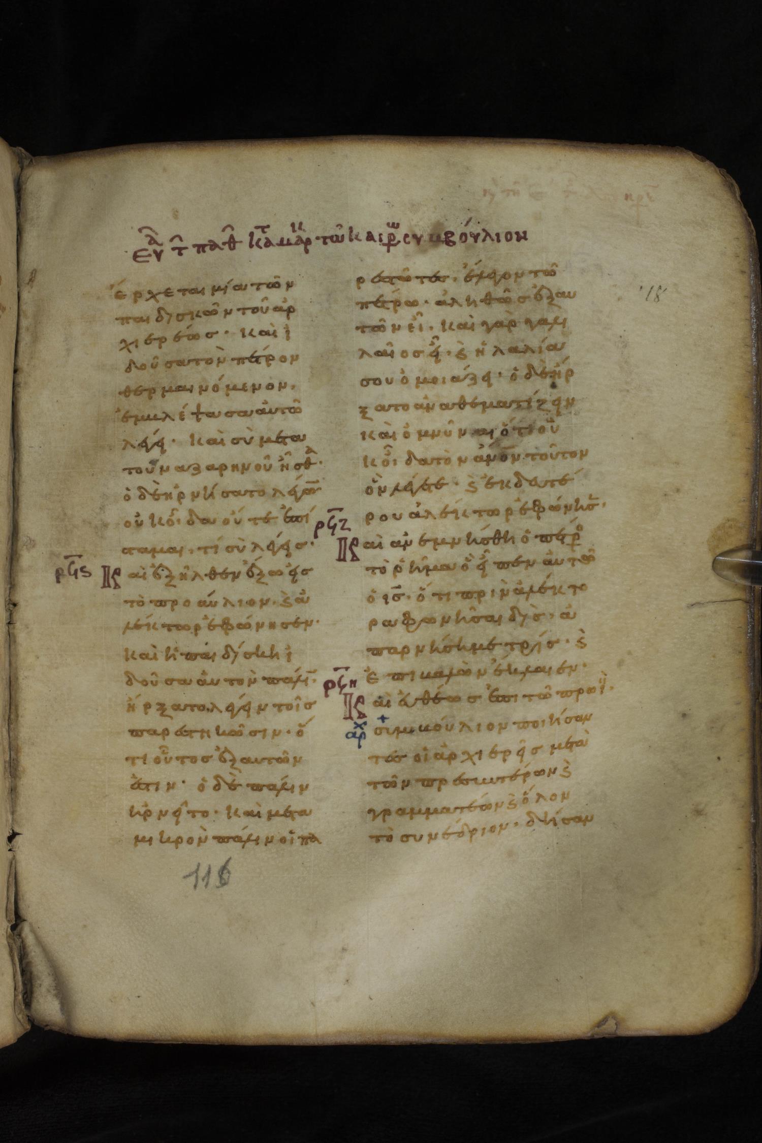 Eleventh century minuscule of the Gospels on parchment; 266 leaves, 2 column, 22 lines per column. Images were taken at the National Library of Greece in Athens.