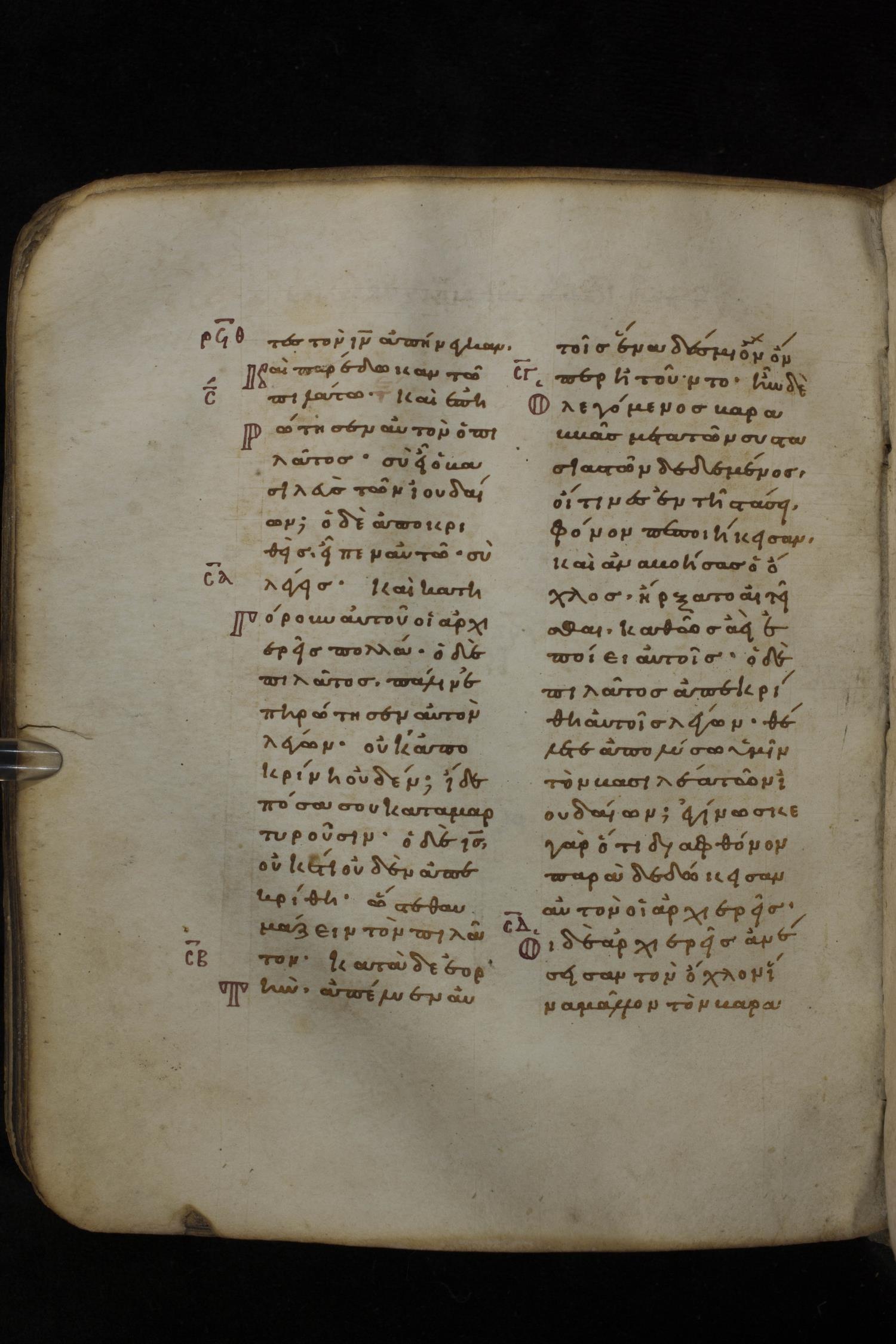 Eleventh century minuscule of the Gospels on parchment; 266 leaves, 2 column, 22 lines per column. Images were taken at the National Library of Greece in Athens.