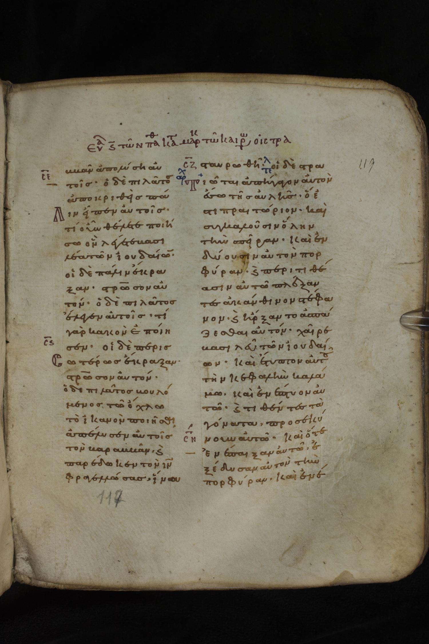 Eleventh century minuscule of the Gospels on parchment; 266 leaves, 2 column, 22 lines per column. Images were taken at the National Library of Greece in Athens.