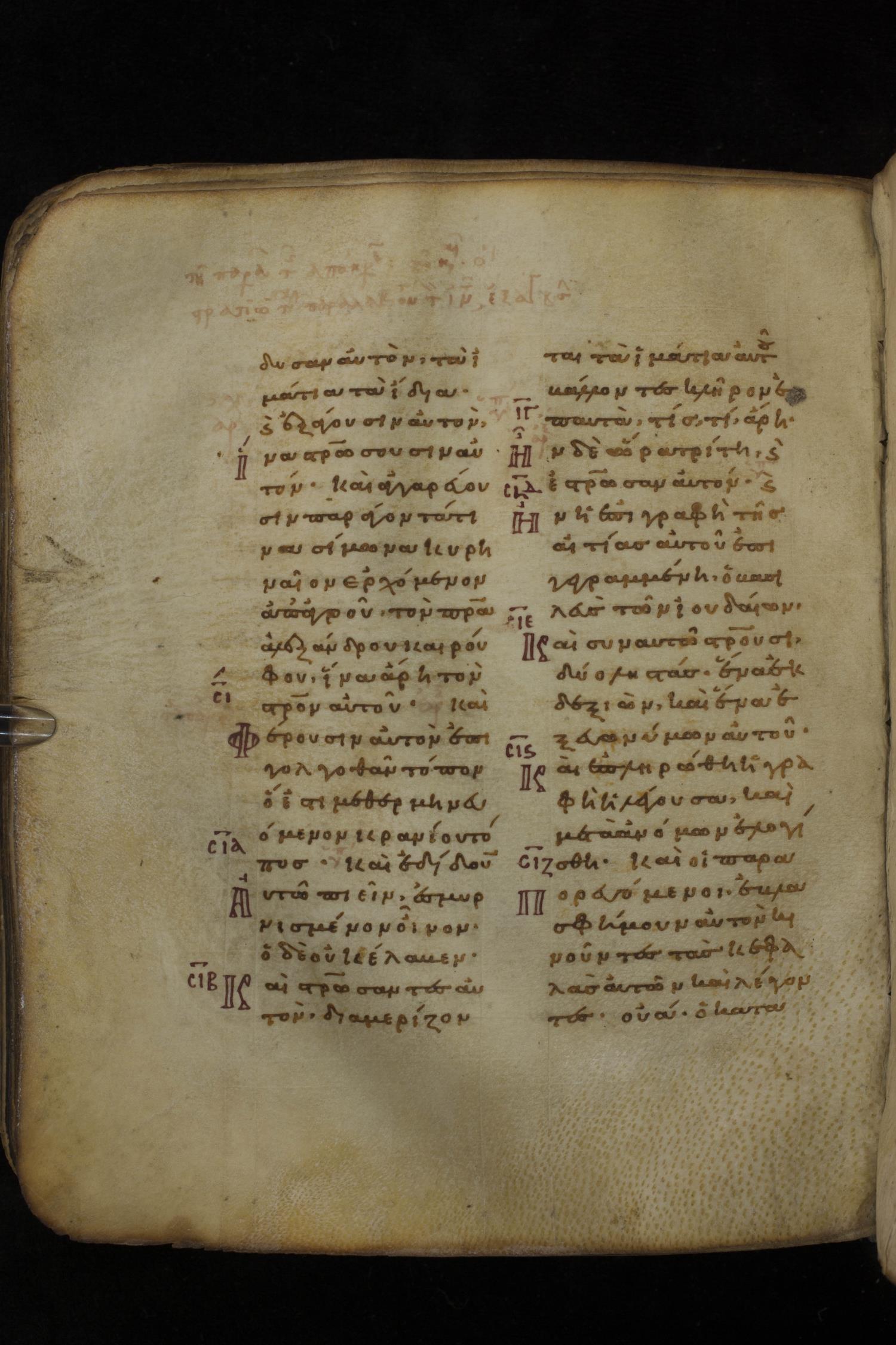 Eleventh century minuscule of the Gospels on parchment; 266 leaves, 2 column, 22 lines per column. Images were taken at the National Library of Greece in Athens.