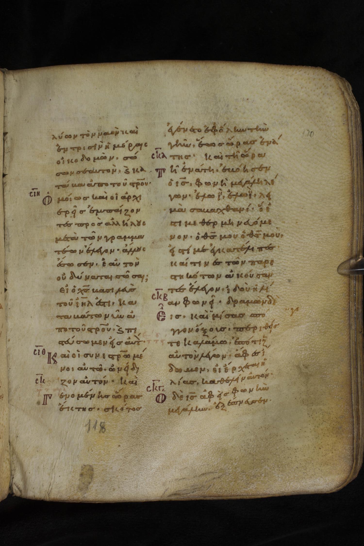Eleventh century minuscule of the Gospels on parchment; 266 leaves, 2 column, 22 lines per column. Images were taken at the National Library of Greece in Athens.