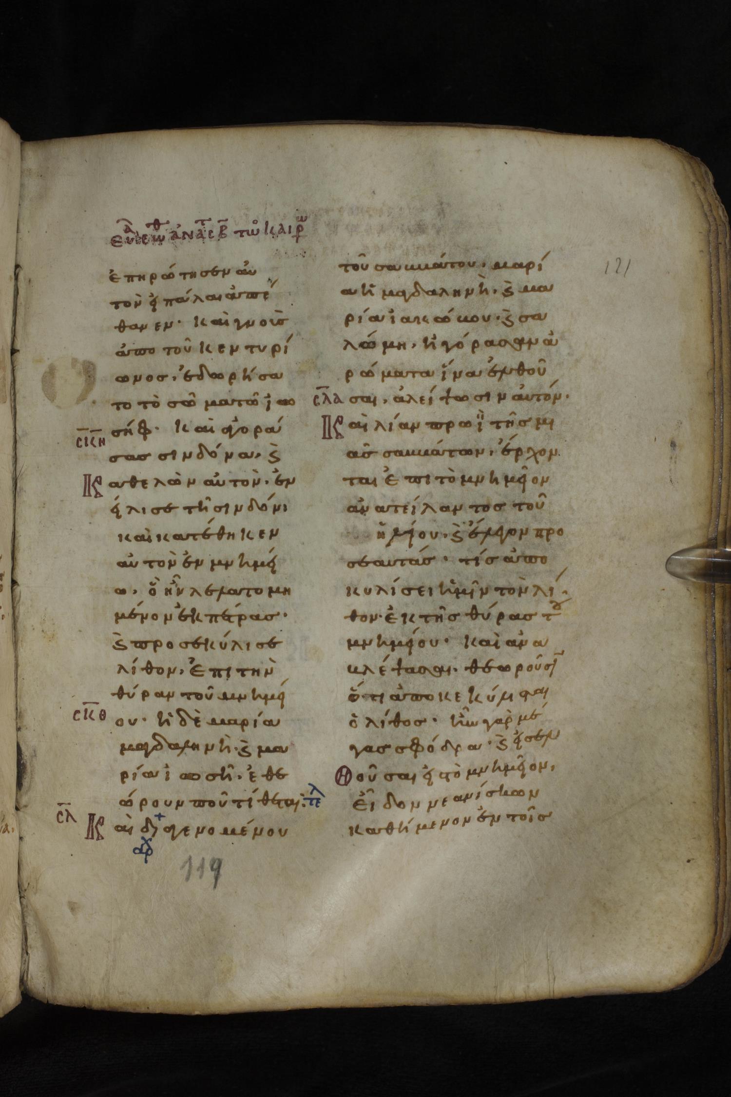 Eleventh century minuscule of the Gospels on parchment; 266 leaves, 2 column, 22 lines per column. Images were taken at the National Library of Greece in Athens.