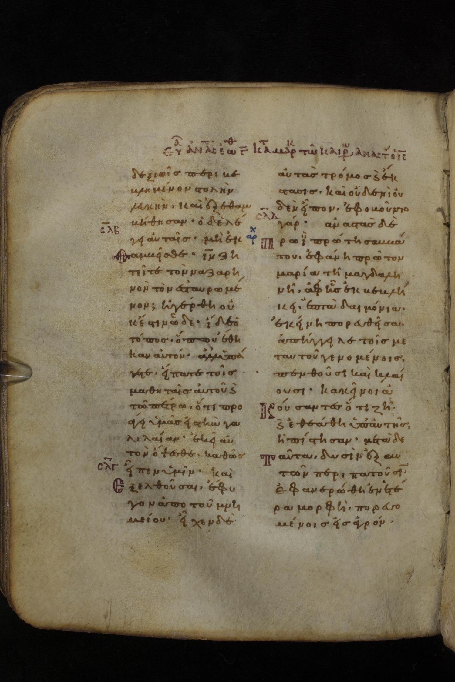 Eleventh century minuscule of the Gospels on parchment; 266 leaves, 2 column, 22 lines per column. Images were taken at the National Library of Greece in Athens.