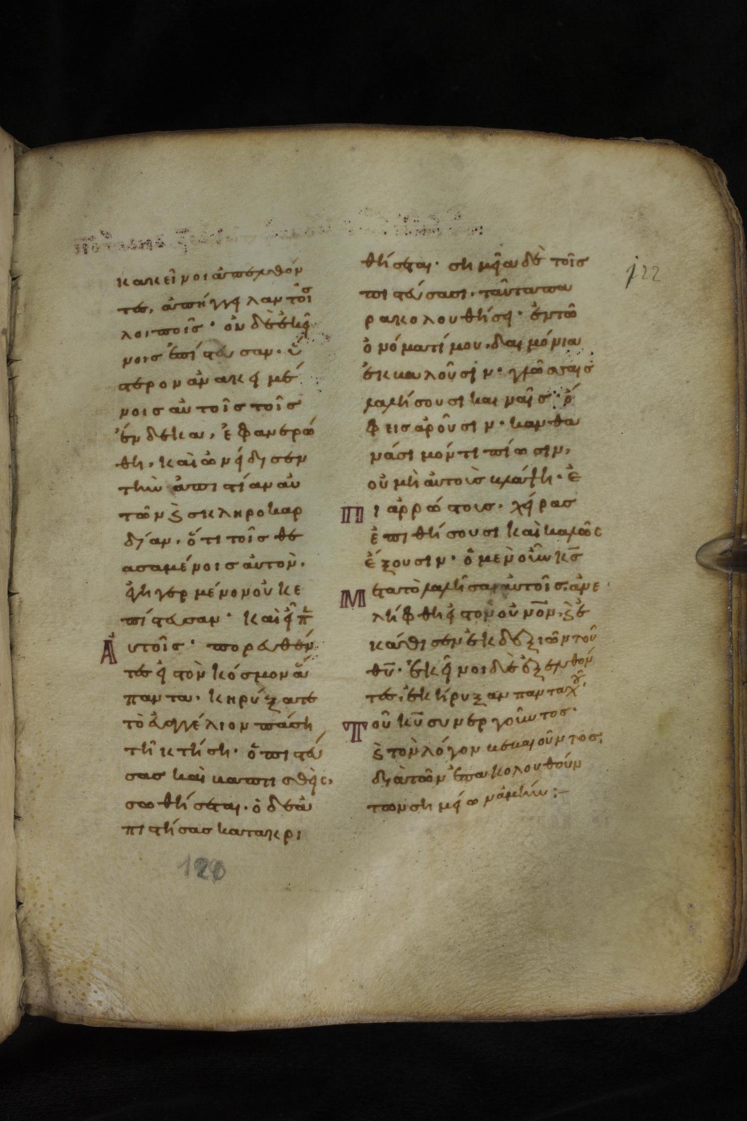 Eleventh century minuscule of the Gospels on parchment; 266 leaves, 2 column, 22 lines per column. Images were taken at the National Library of Greece in Athens.