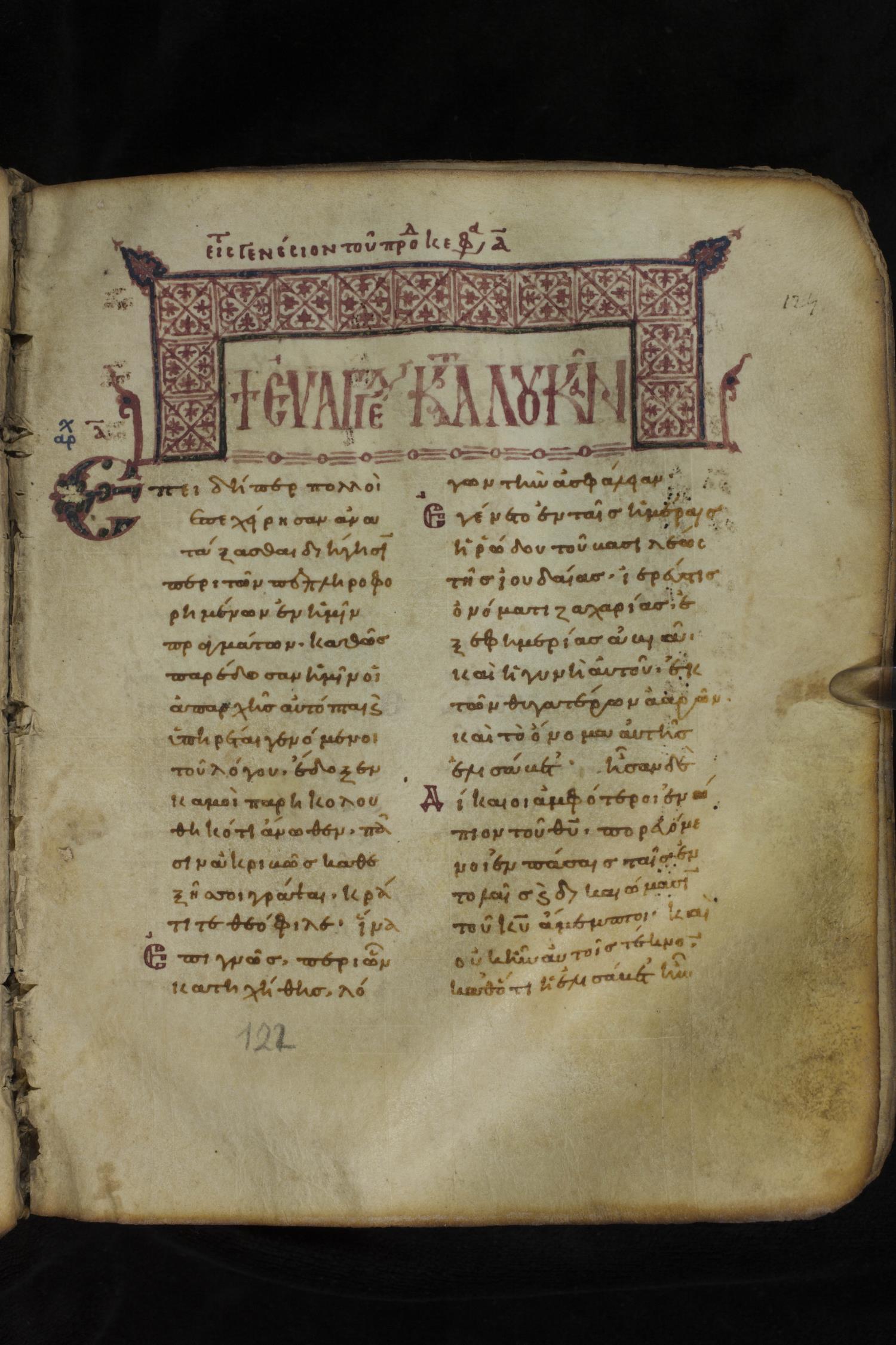 Eleventh century minuscule of the Gospels on parchment; 266 leaves, 2 column, 22 lines per column. Images were taken at the National Library of Greece in Athens.
