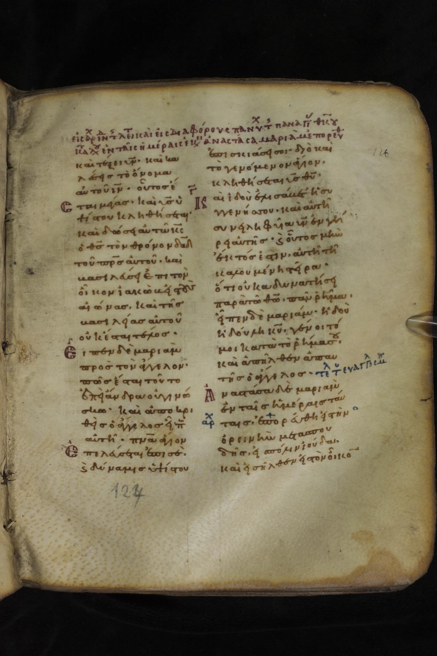 Eleventh century minuscule of the Gospels on parchment; 266 leaves, 2 column, 22 lines per column. Images were taken at the National Library of Greece in Athens.