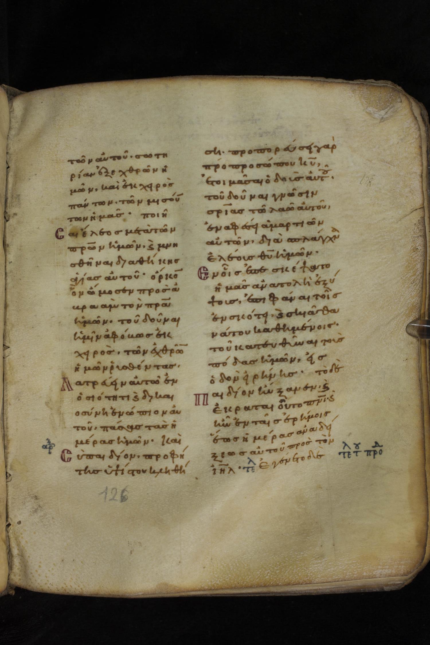 Eleventh century minuscule of the Gospels on parchment; 266 leaves, 2 column, 22 lines per column. Images were taken at the National Library of Greece in Athens.