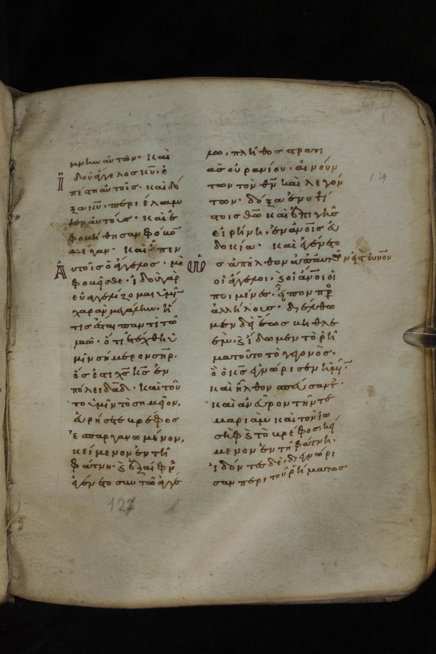 Eleventh century minuscule of the Gospels on parchment; 266 leaves, 2 column, 22 lines per column. Images were taken at the National Library of Greece in Athens.