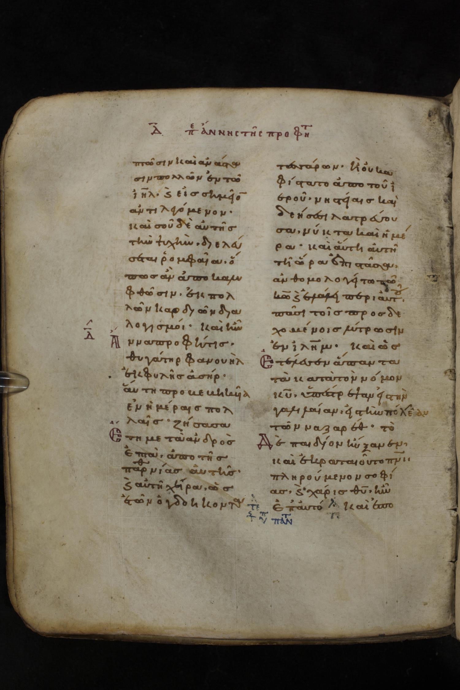 Eleventh century minuscule of the Gospels on parchment; 266 leaves, 2 column, 22 lines per column. Images were taken at the National Library of Greece in Athens.