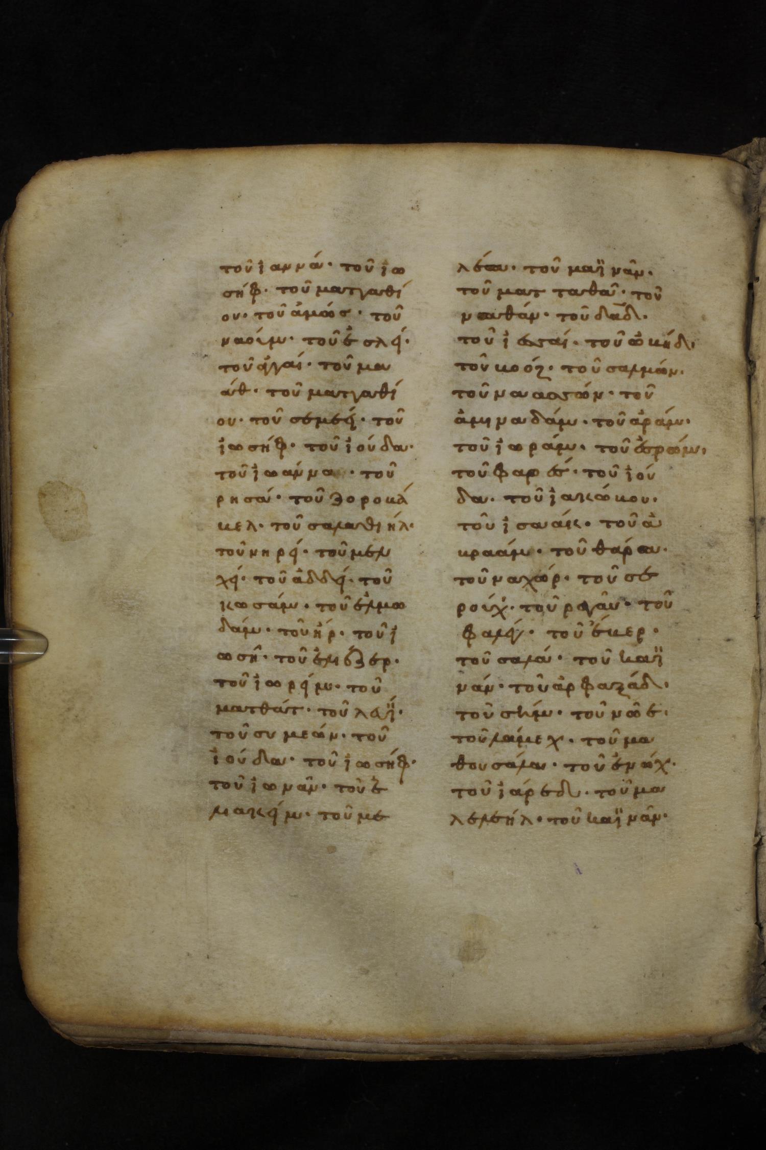 Eleventh century minuscule of the Gospels on parchment; 266 leaves, 2 column, 22 lines per column. Images were taken at the National Library of Greece in Athens.