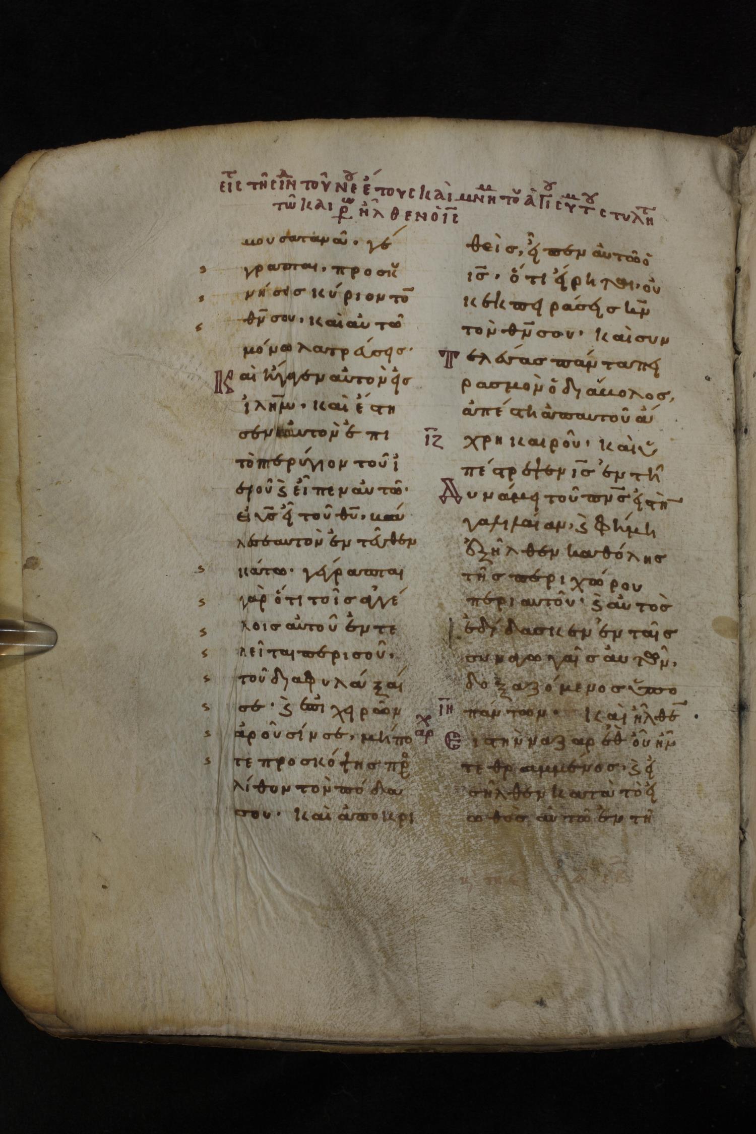 Eleventh century minuscule of the Gospels on parchment; 266 leaves, 2 column, 22 lines per column. Images were taken at the National Library of Greece in Athens.