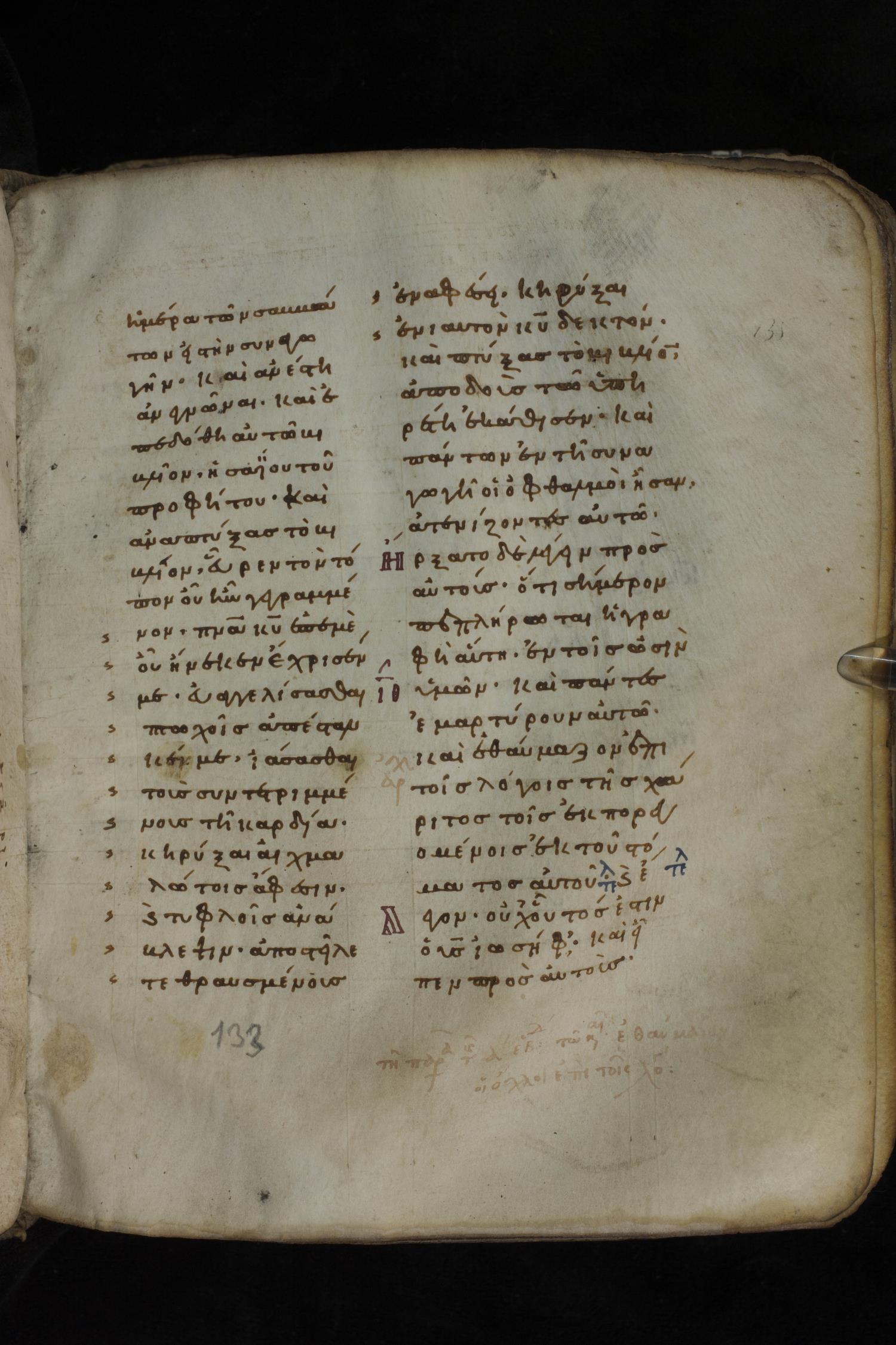 Eleventh century minuscule of the Gospels on parchment; 266 leaves, 2 column, 22 lines per column. Images were taken at the National Library of Greece in Athens.