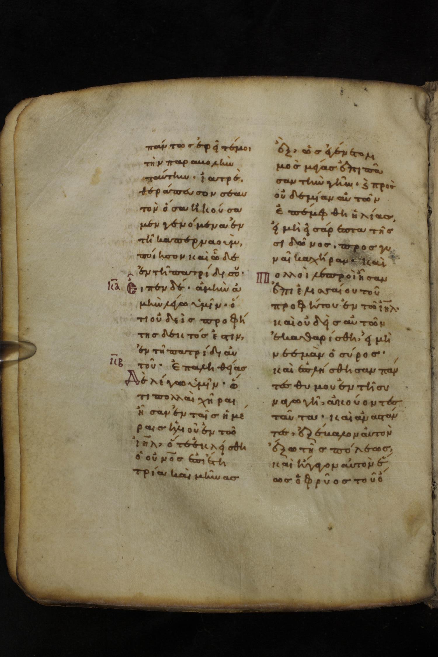 Eleventh century minuscule of the Gospels on parchment; 266 leaves, 2 column, 22 lines per column. Images were taken at the National Library of Greece in Athens.