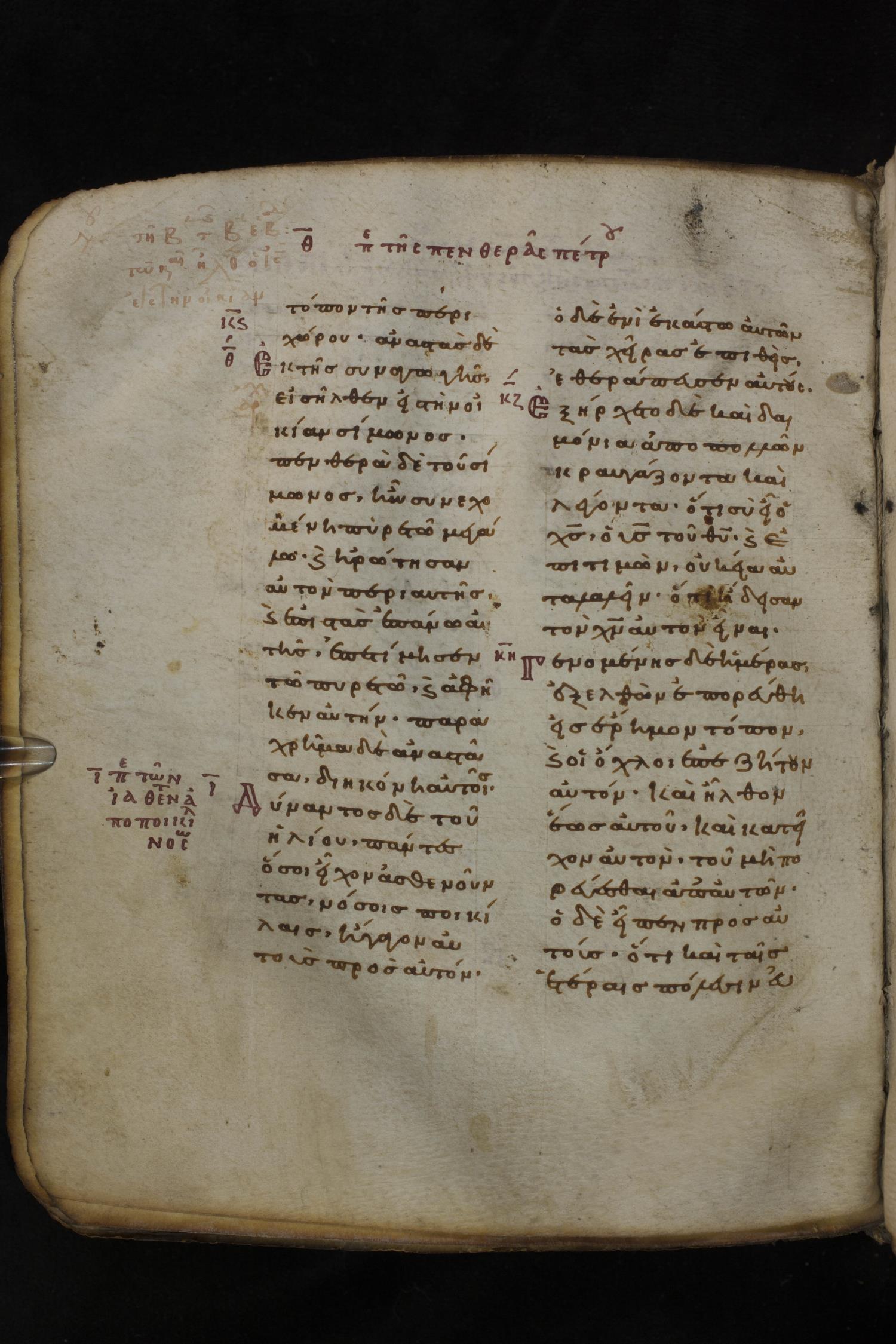 Eleventh century minuscule of the Gospels on parchment; 266 leaves, 2 column, 22 lines per column. Images were taken at the National Library of Greece in Athens.