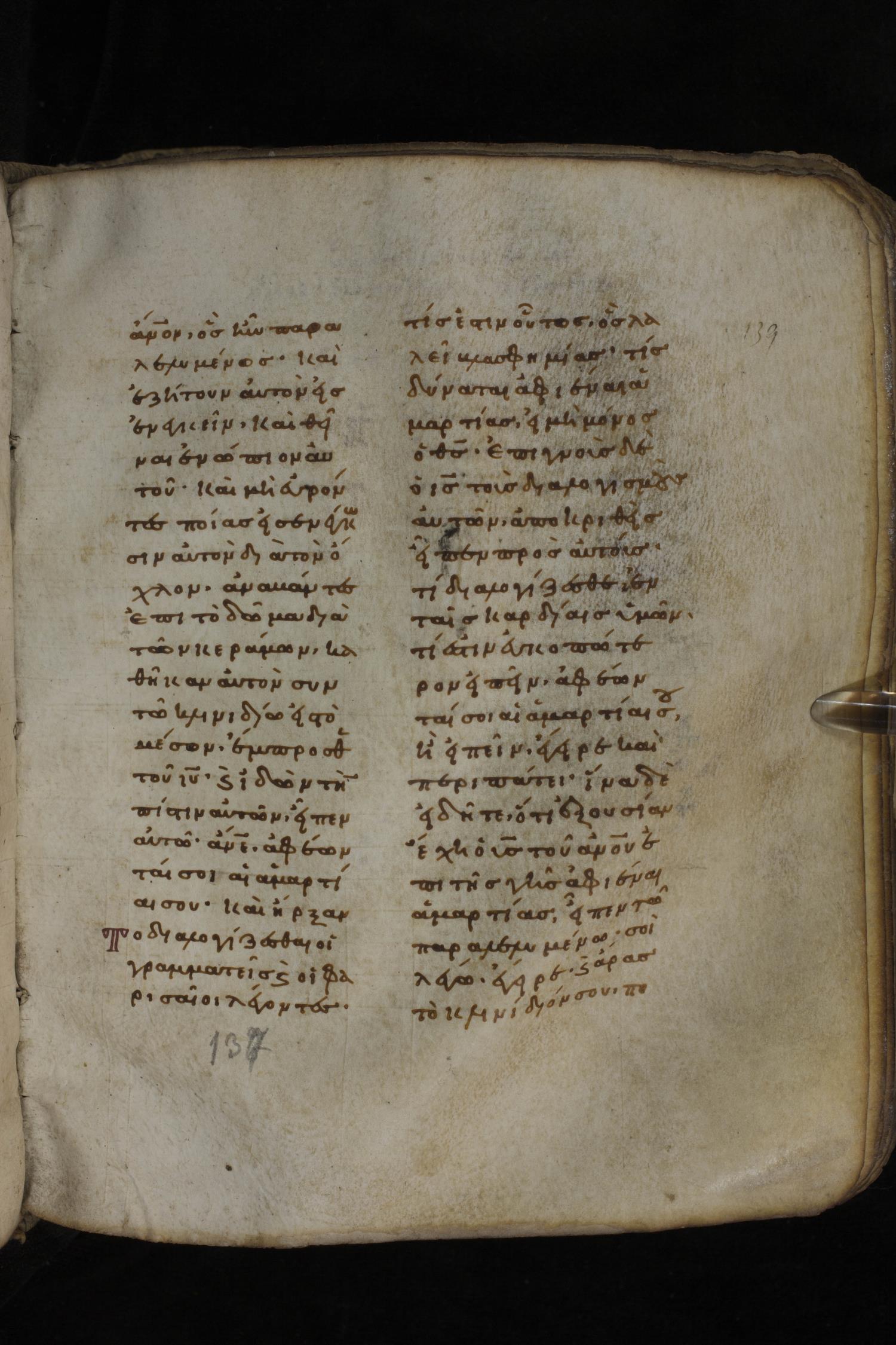Eleventh century minuscule of the Gospels on parchment; 266 leaves, 2 column, 22 lines per column. Images were taken at the National Library of Greece in Athens.