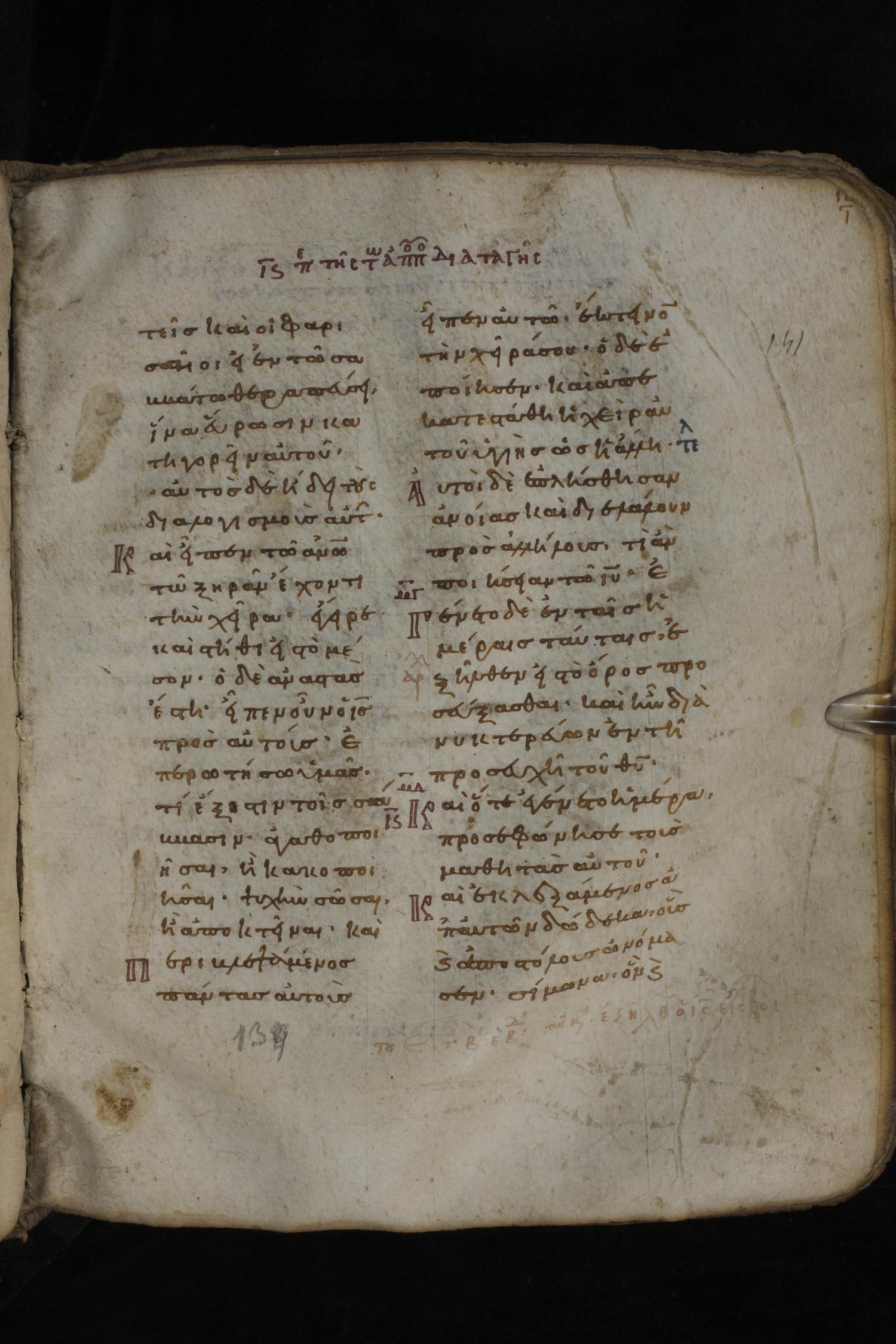 Eleventh century minuscule of the Gospels on parchment; 266 leaves, 2 column, 22 lines per column. Images were taken at the National Library of Greece in Athens.