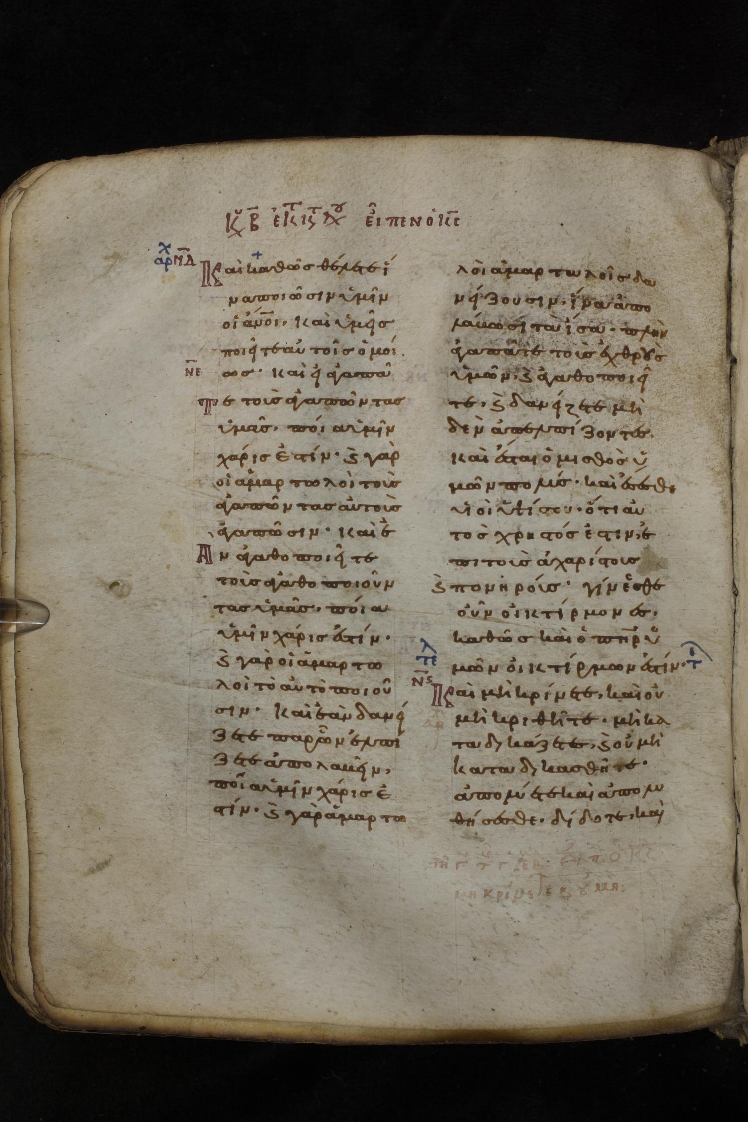 Eleventh century minuscule of the Gospels on parchment; 266 leaves, 2 column, 22 lines per column. Images were taken at the National Library of Greece in Athens.