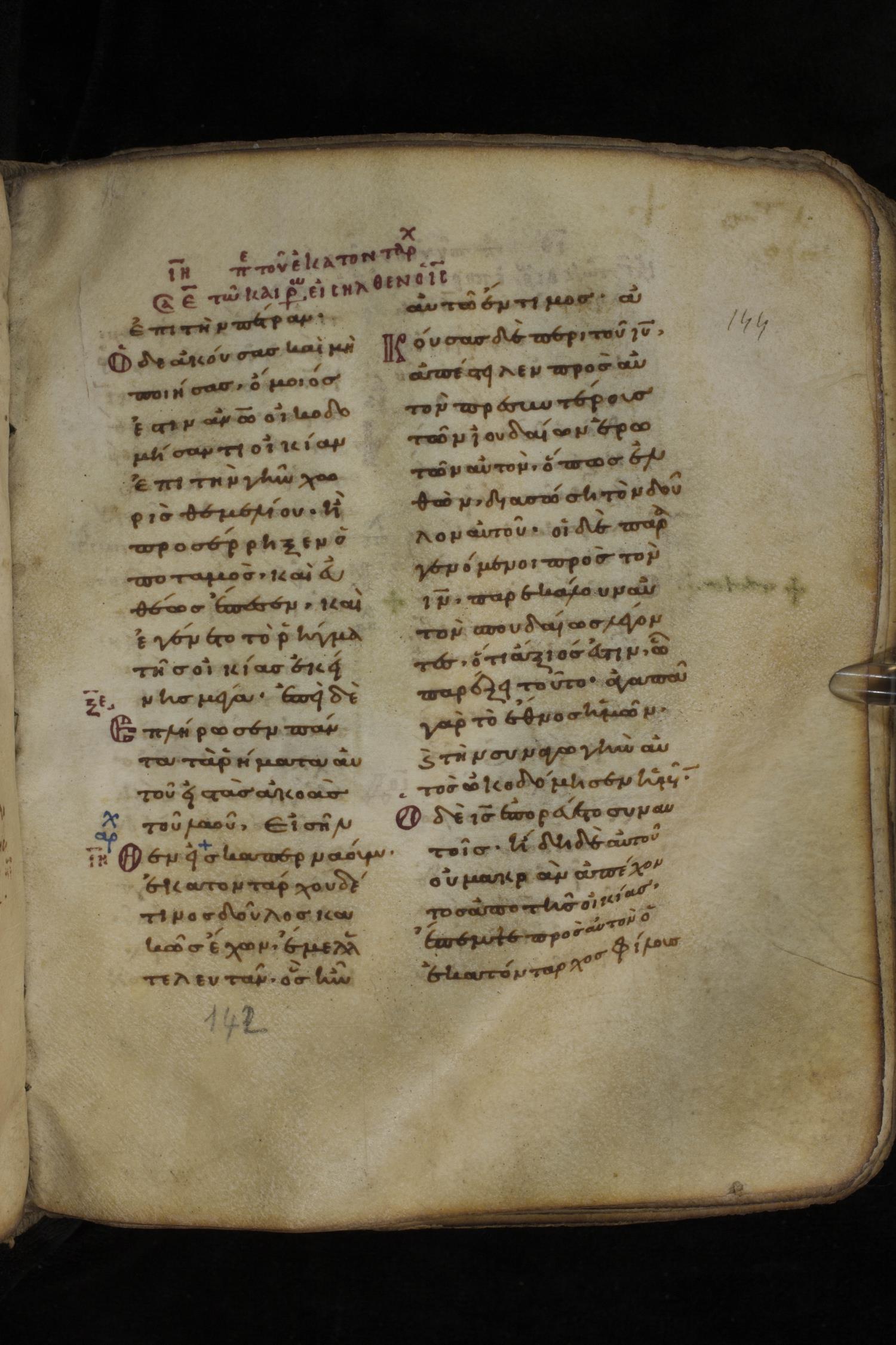 Eleventh century minuscule of the Gospels on parchment; 266 leaves, 2 column, 22 lines per column. Images were taken at the National Library of Greece in Athens.