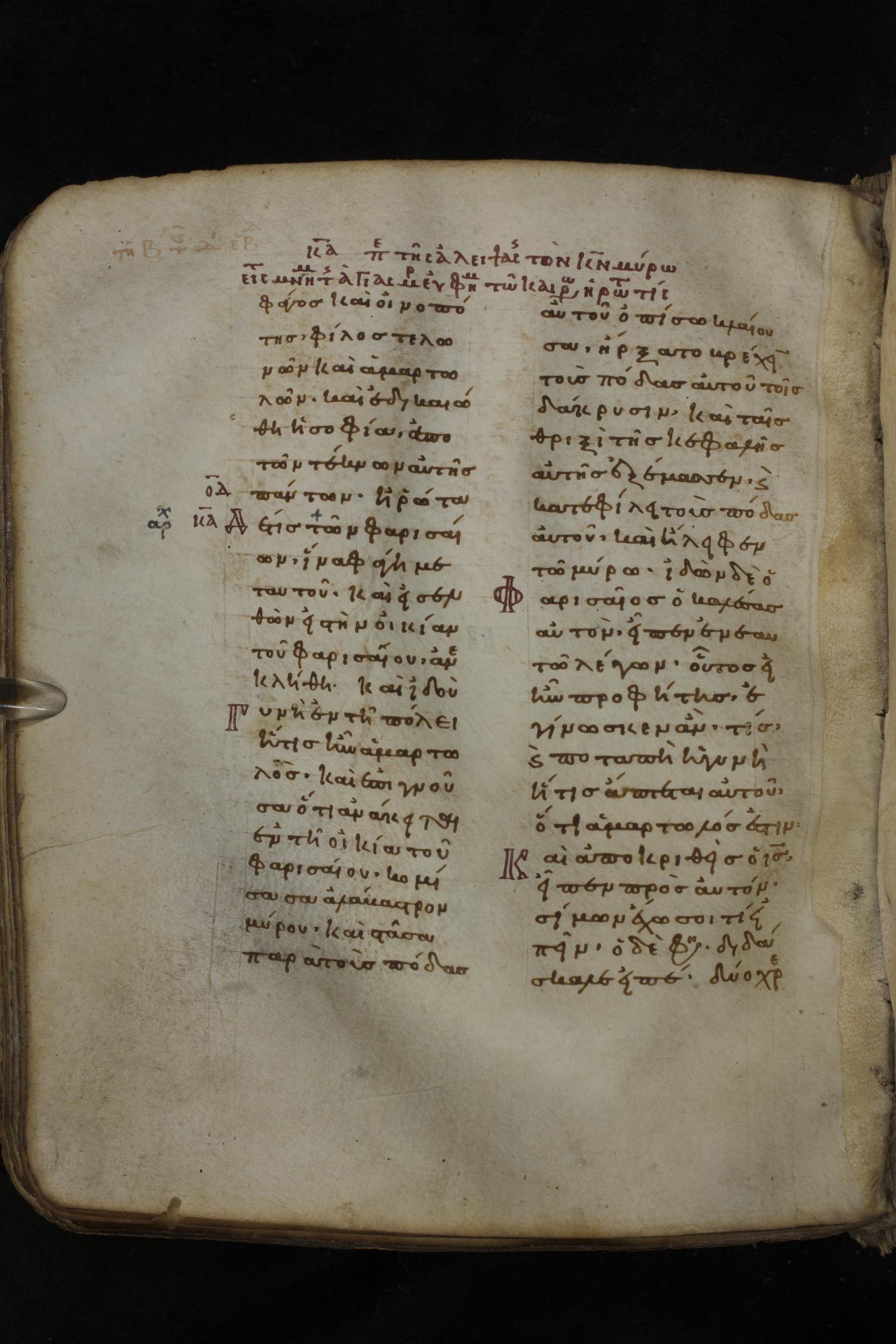 Eleventh century minuscule of the Gospels on parchment; 266 leaves, 2 column, 22 lines per column. Images were taken at the National Library of Greece in Athens.