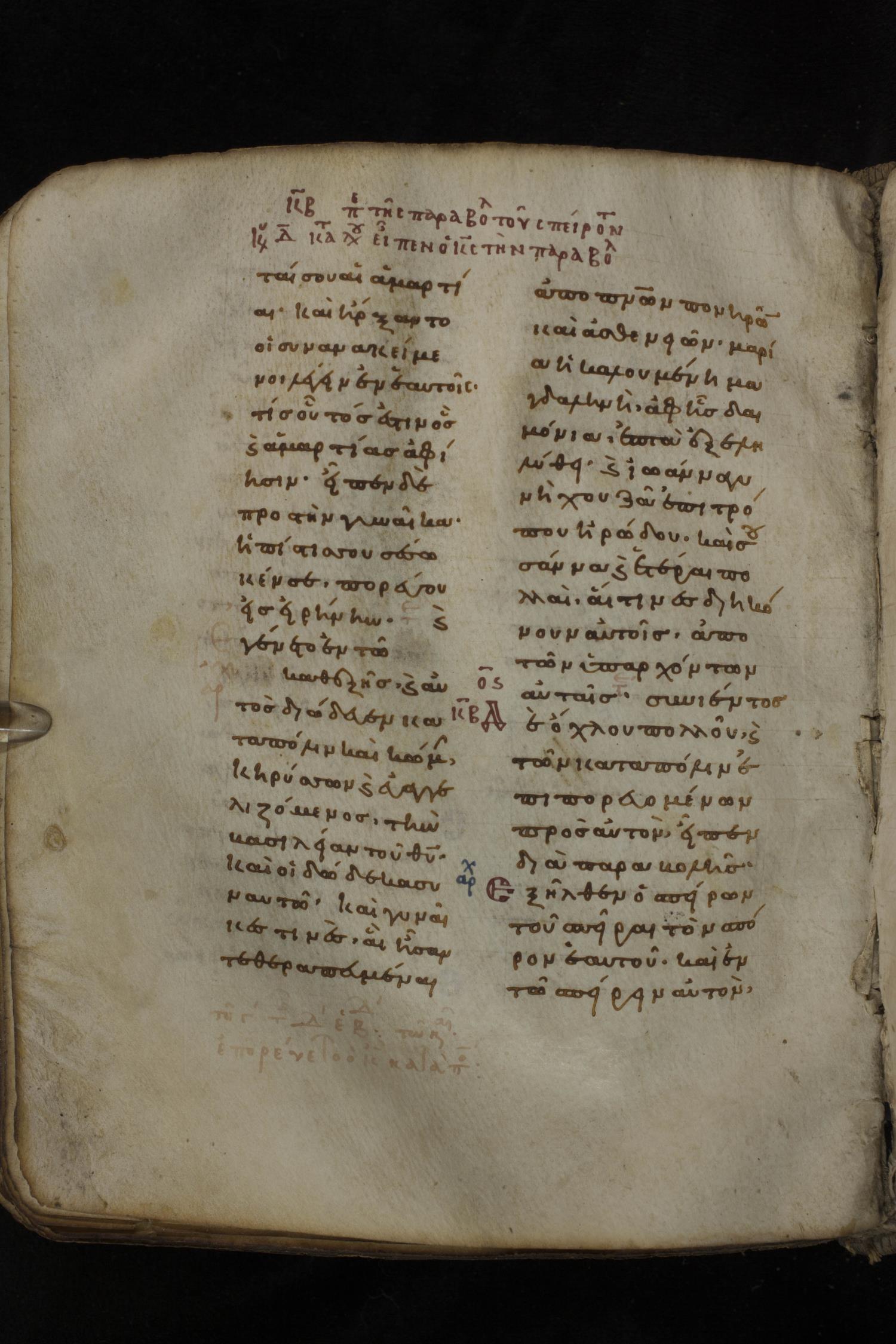 Eleventh century minuscule of the Gospels on parchment; 266 leaves, 2 column, 22 lines per column. Images were taken at the National Library of Greece in Athens.