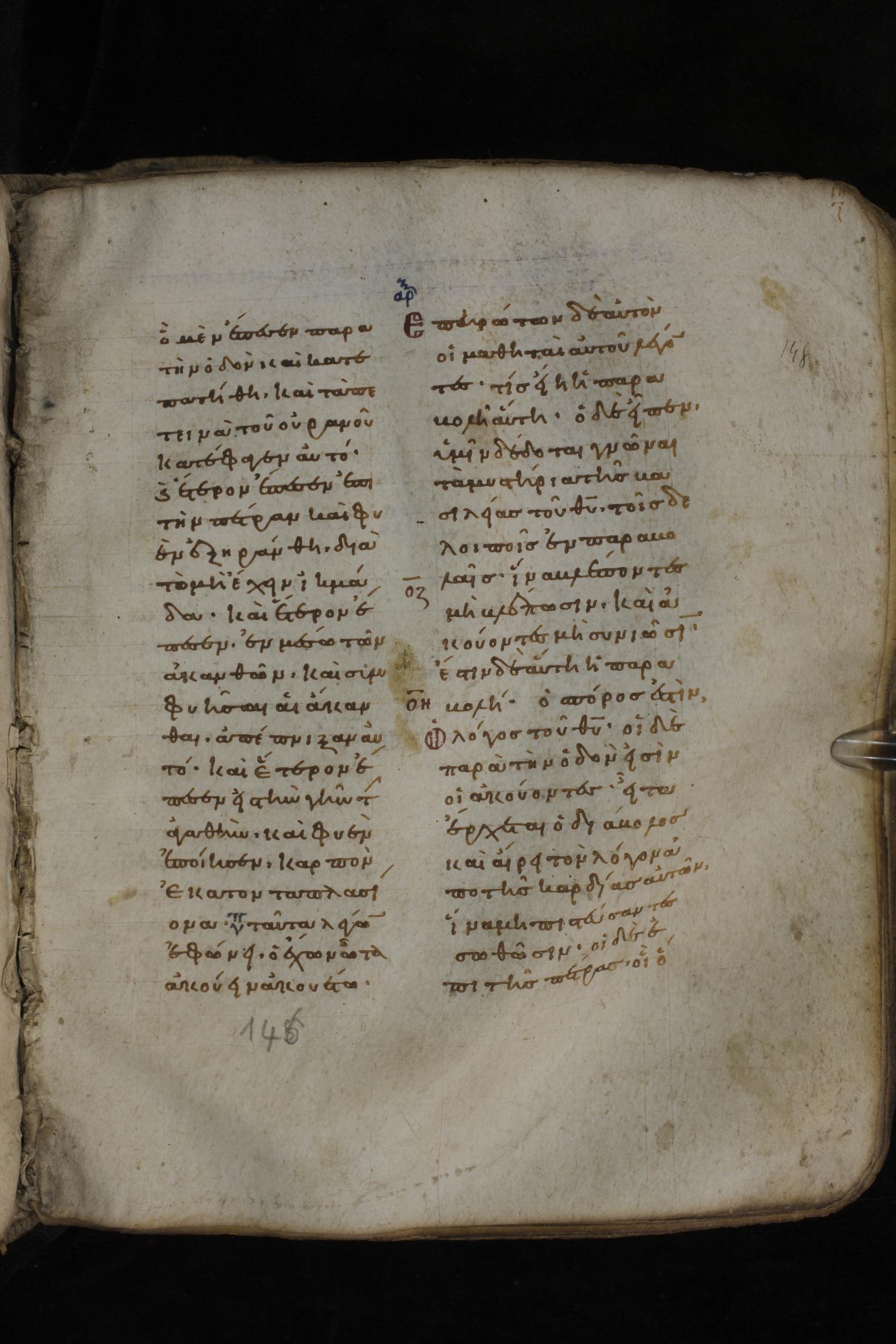Eleventh century minuscule of the Gospels on parchment; 266 leaves, 2 column, 22 lines per column. Images were taken at the National Library of Greece in Athens.