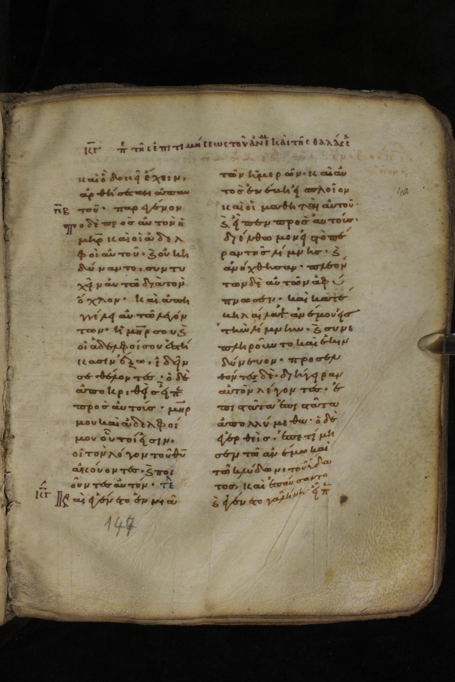 Eleventh century minuscule of the Gospels on parchment; 266 leaves, 2 column, 22 lines per column. Images were taken at the National Library of Greece in Athens.