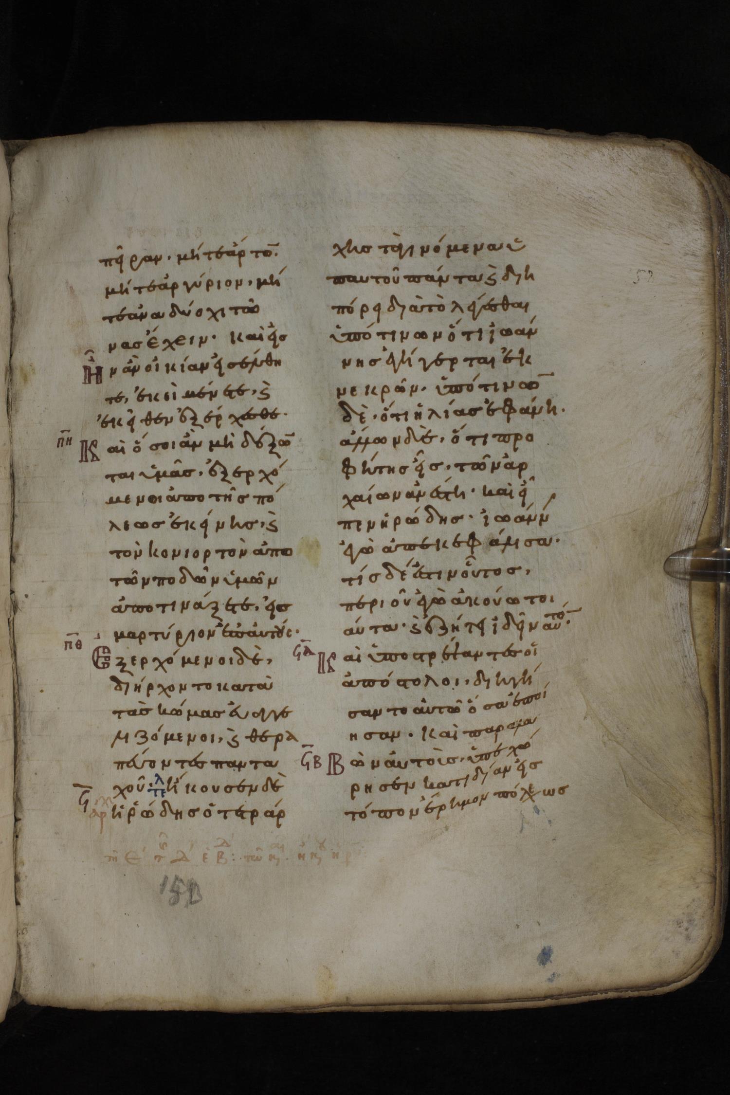 Eleventh century minuscule of the Gospels on parchment; 266 leaves, 2 column, 22 lines per column. Images were taken at the National Library of Greece in Athens.