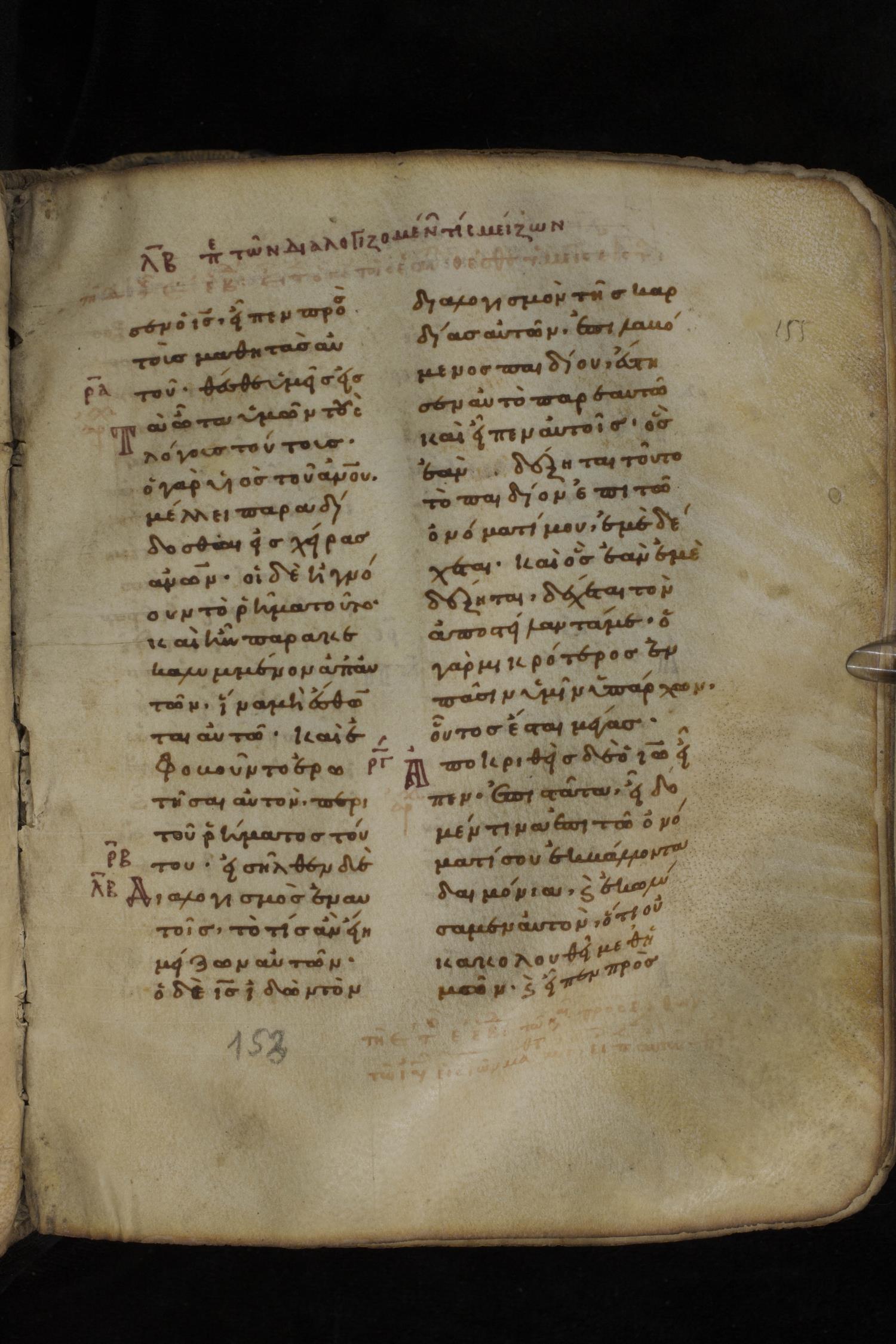 Eleventh century minuscule of the Gospels on parchment; 266 leaves, 2 column, 22 lines per column. Images were taken at the National Library of Greece in Athens.