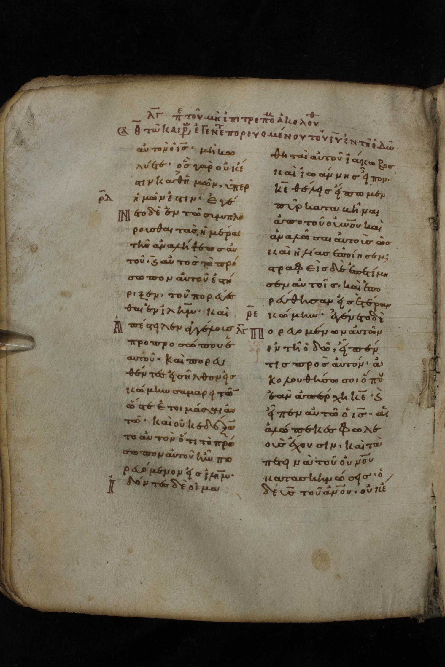 Eleventh century minuscule of the Gospels on parchment; 266 leaves, 2 column, 22 lines per column. Images were taken at the National Library of Greece in Athens.