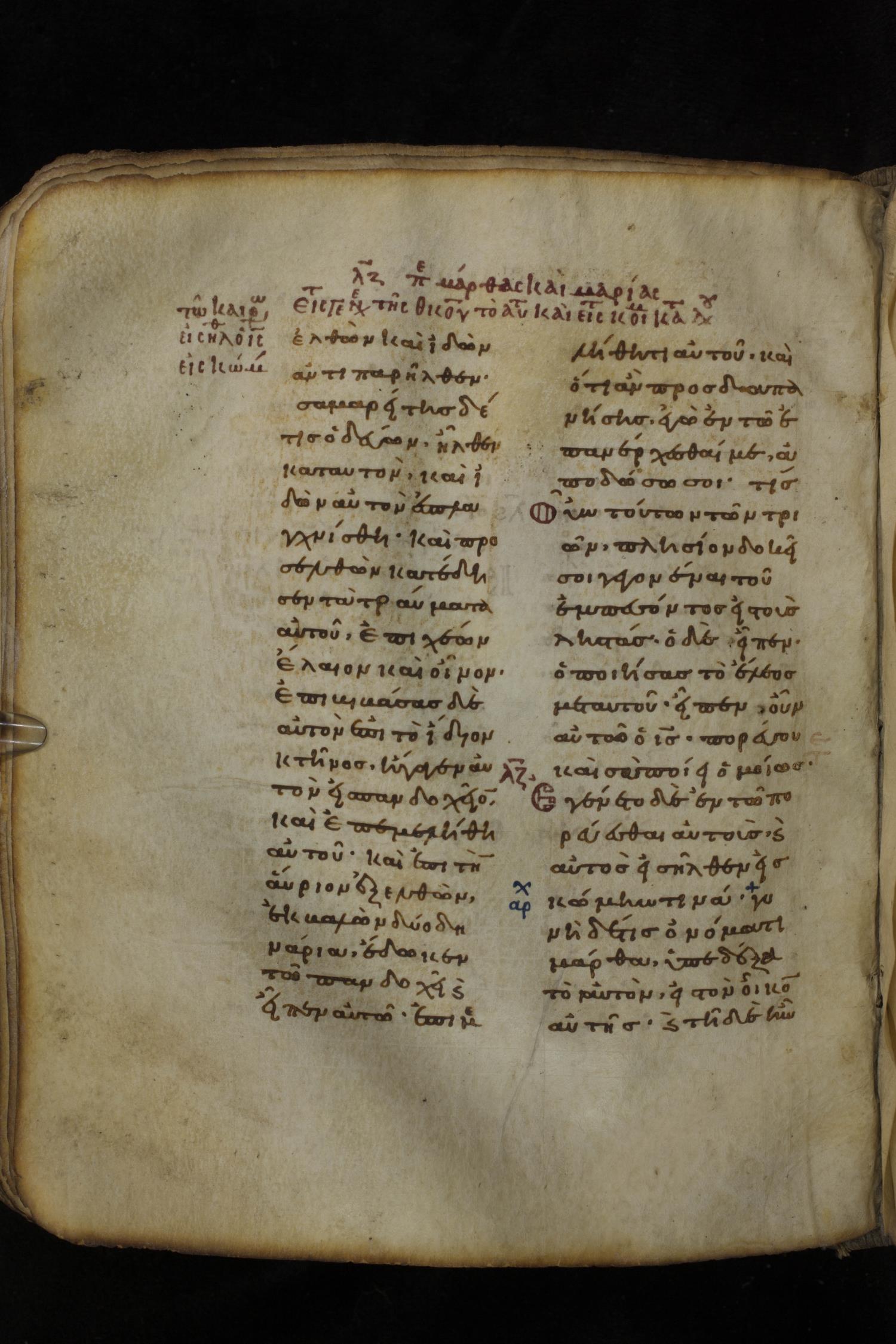 Eleventh century minuscule of the Gospels on parchment; 266 leaves, 2 column, 22 lines per column. Images were taken at the National Library of Greece in Athens.