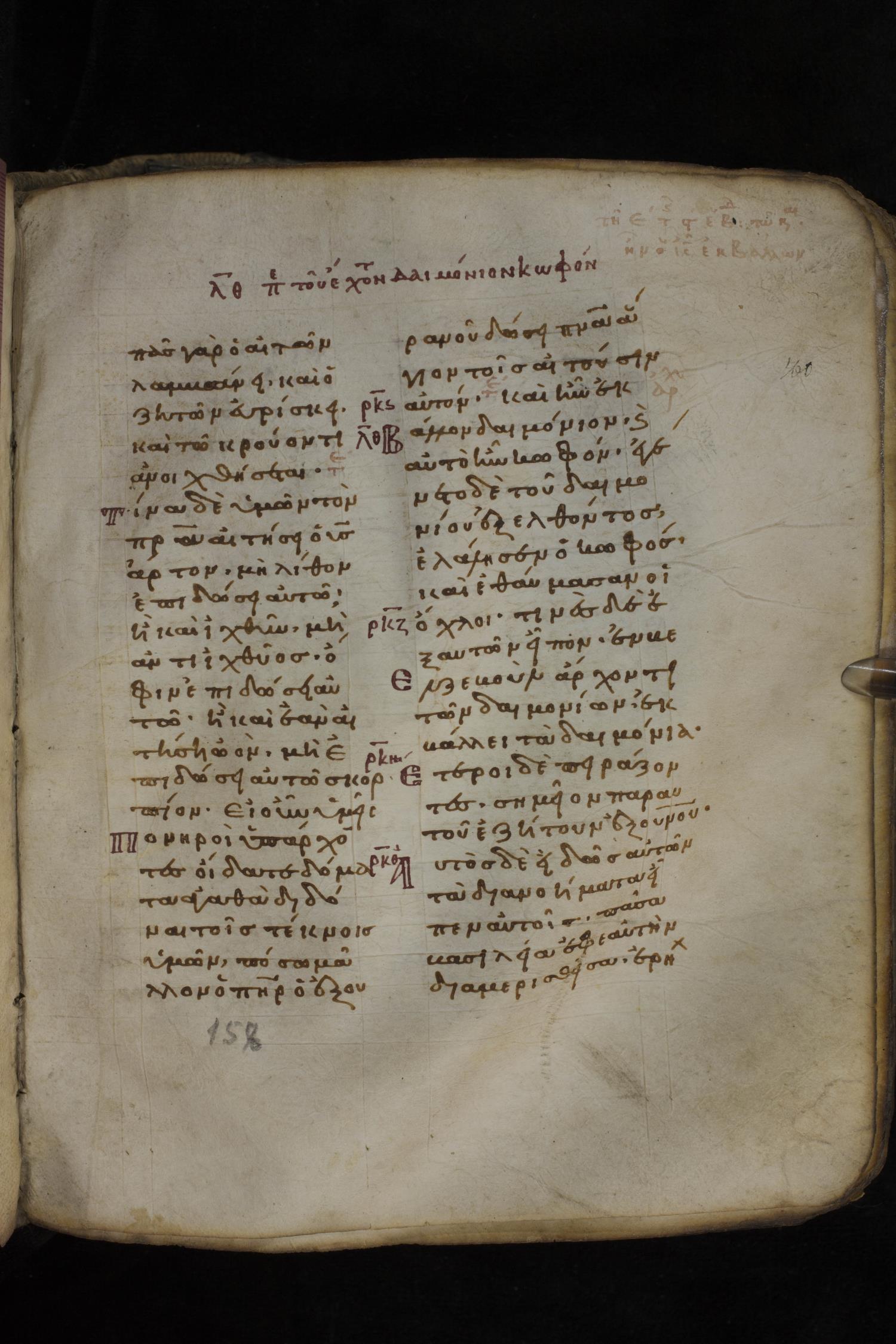Eleventh century minuscule of the Gospels on parchment; 266 leaves, 2 column, 22 lines per column. Images were taken at the National Library of Greece in Athens.