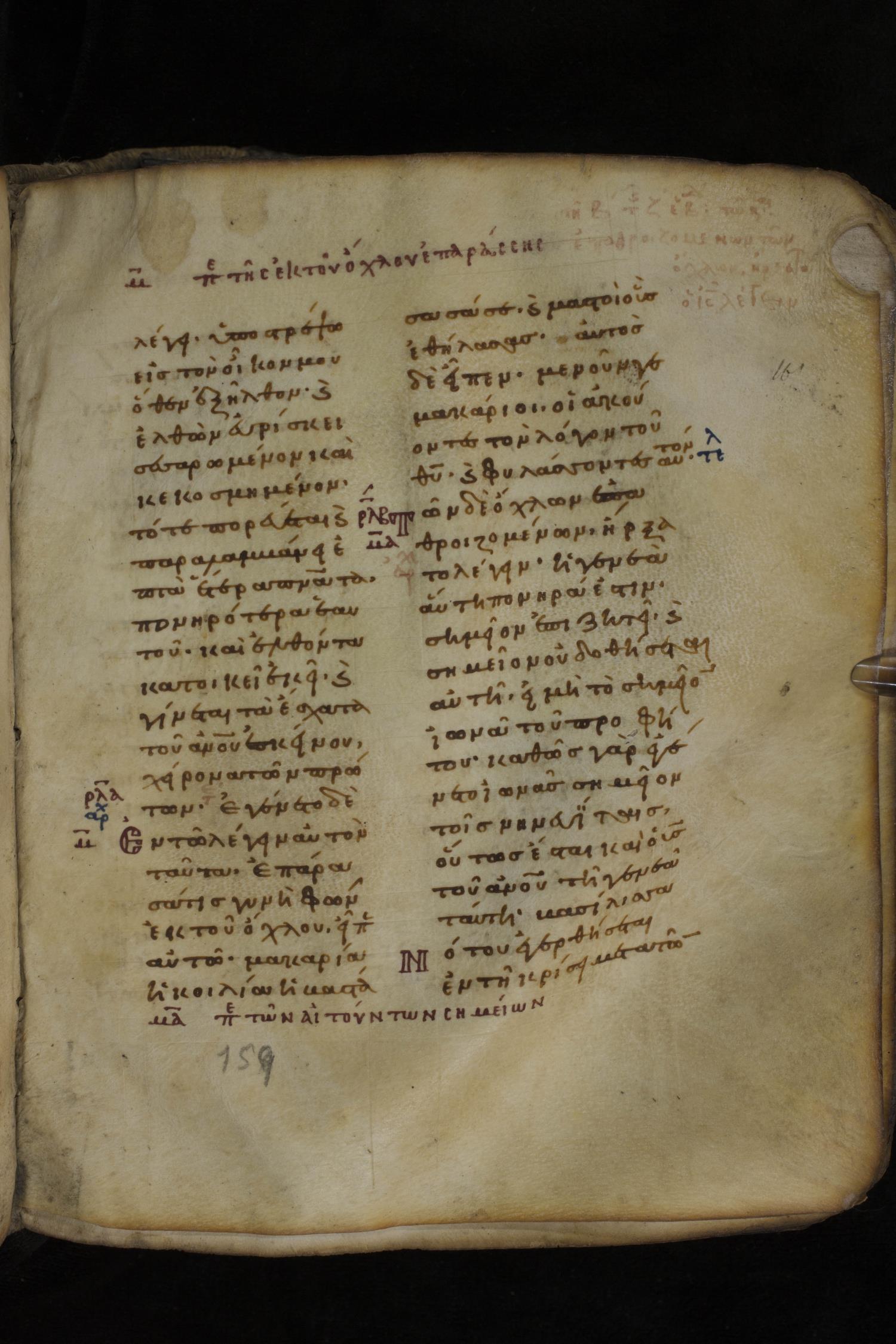 Eleventh century minuscule of the Gospels on parchment; 266 leaves, 2 column, 22 lines per column. Images were taken at the National Library of Greece in Athens.