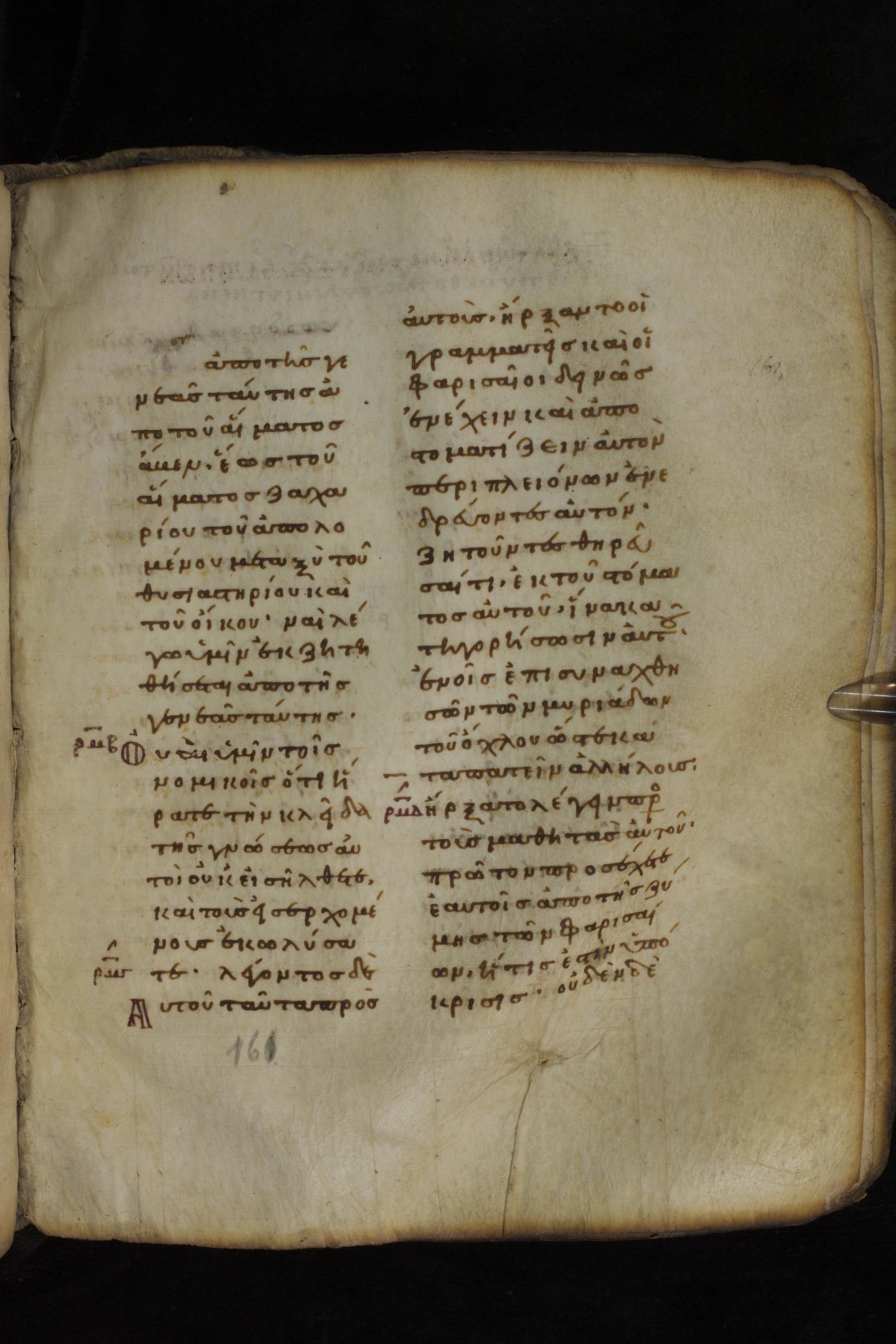 Eleventh century minuscule of the Gospels on parchment; 266 leaves, 2 column, 22 lines per column. Images were taken at the National Library of Greece in Athens.