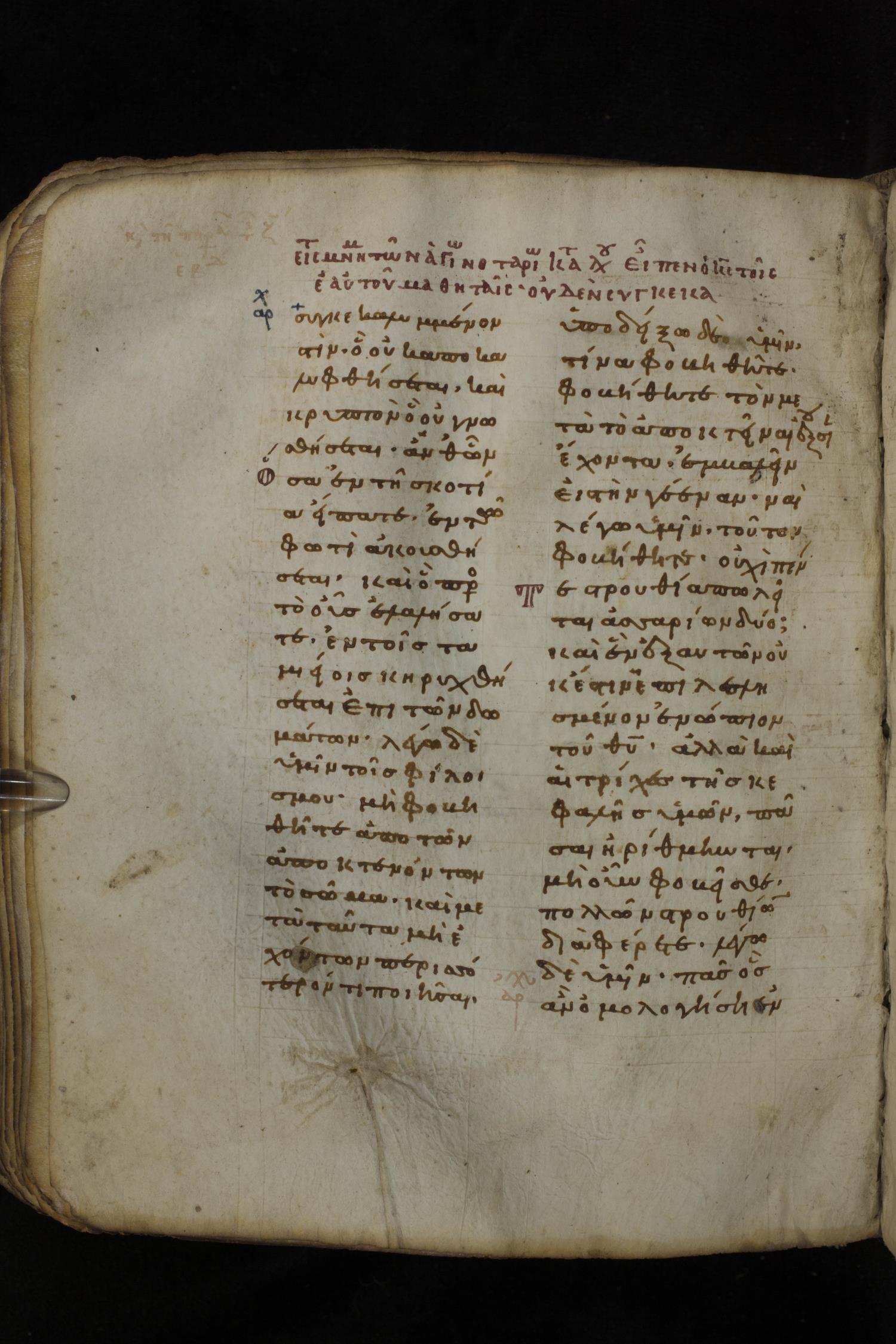 Eleventh century minuscule of the Gospels on parchment; 266 leaves, 2 column, 22 lines per column. Images were taken at the National Library of Greece in Athens.