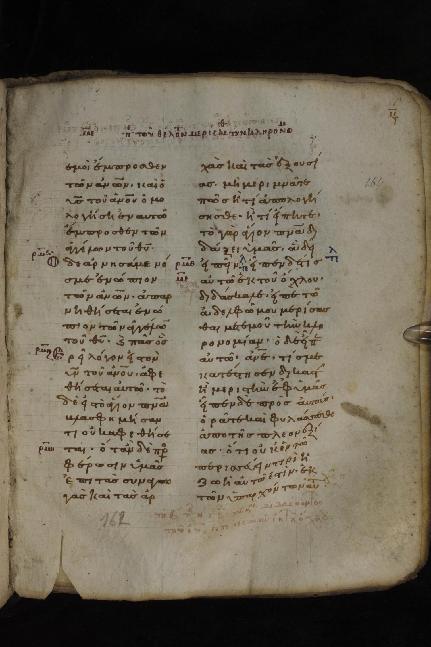 Eleventh century minuscule of the Gospels on parchment; 266 leaves, 2 column, 22 lines per column. Images were taken at the National Library of Greece in Athens.