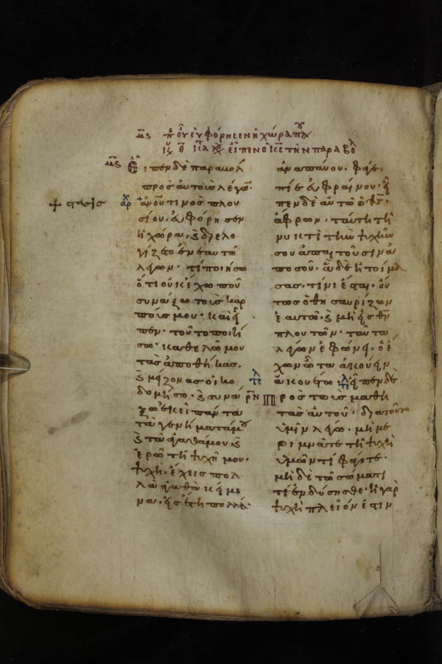 Eleventh century minuscule of the Gospels on parchment; 266 leaves, 2 column, 22 lines per column. Images were taken at the National Library of Greece in Athens.