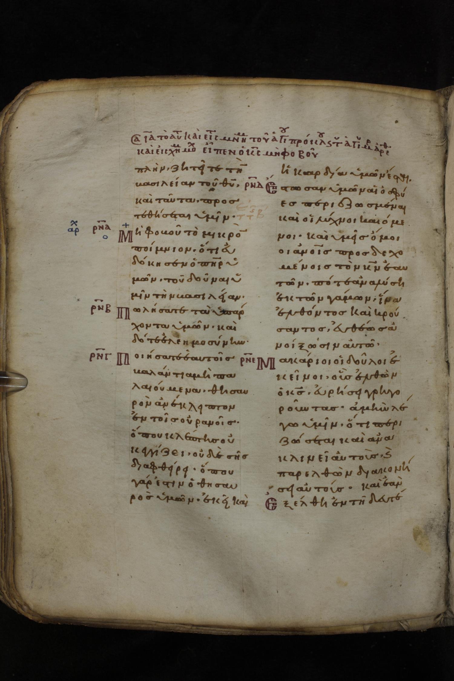 Eleventh century minuscule of the Gospels on parchment; 266 leaves, 2 column, 22 lines per column. Images were taken at the National Library of Greece in Athens.