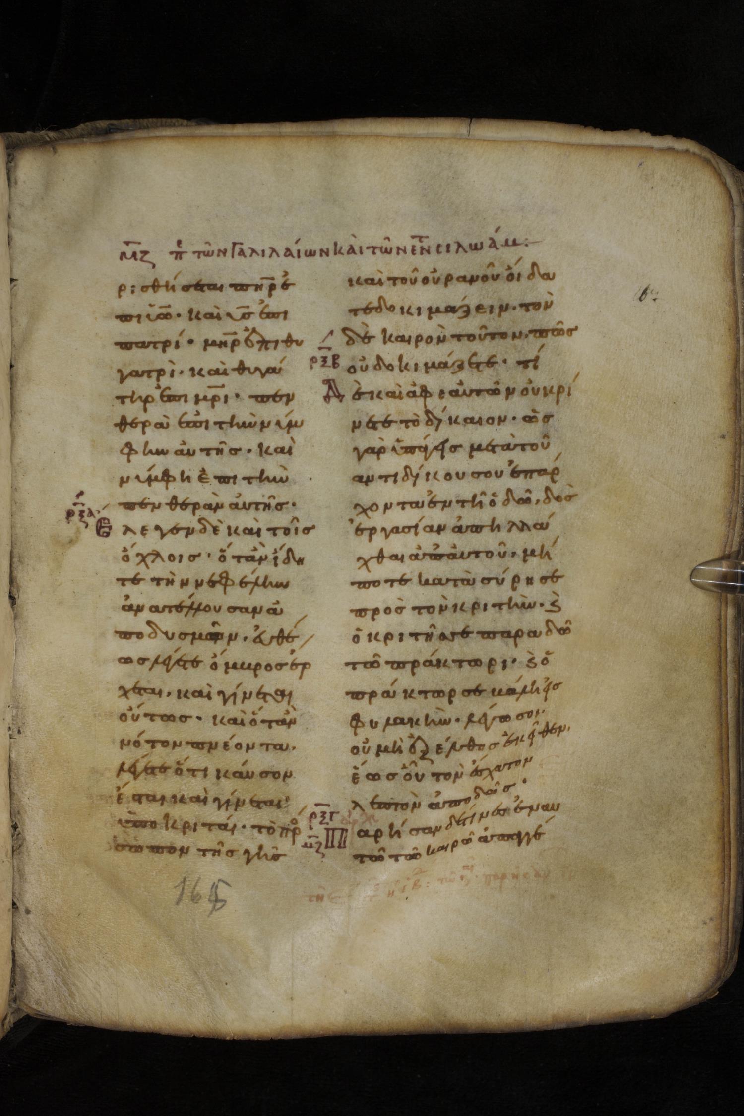 Eleventh century minuscule of the Gospels on parchment; 266 leaves, 2 column, 22 lines per column. Images were taken at the National Library of Greece in Athens.