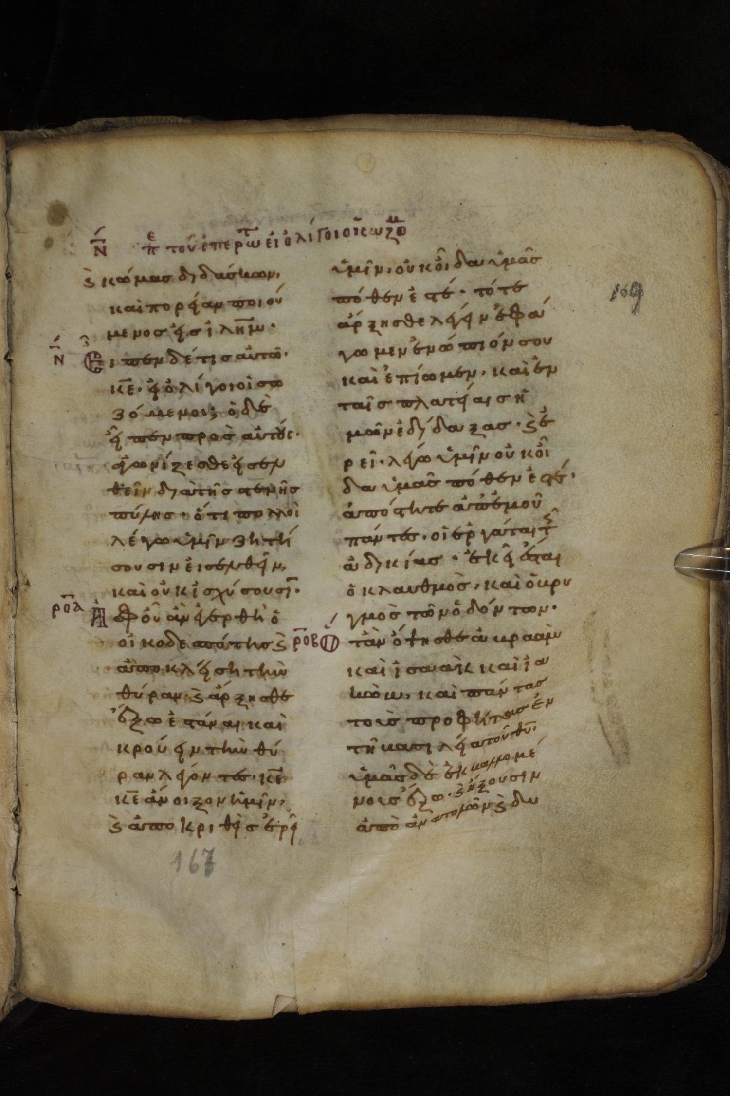Eleventh century minuscule of the Gospels on parchment; 266 leaves, 2 column, 22 lines per column. Images were taken at the National Library of Greece in Athens.